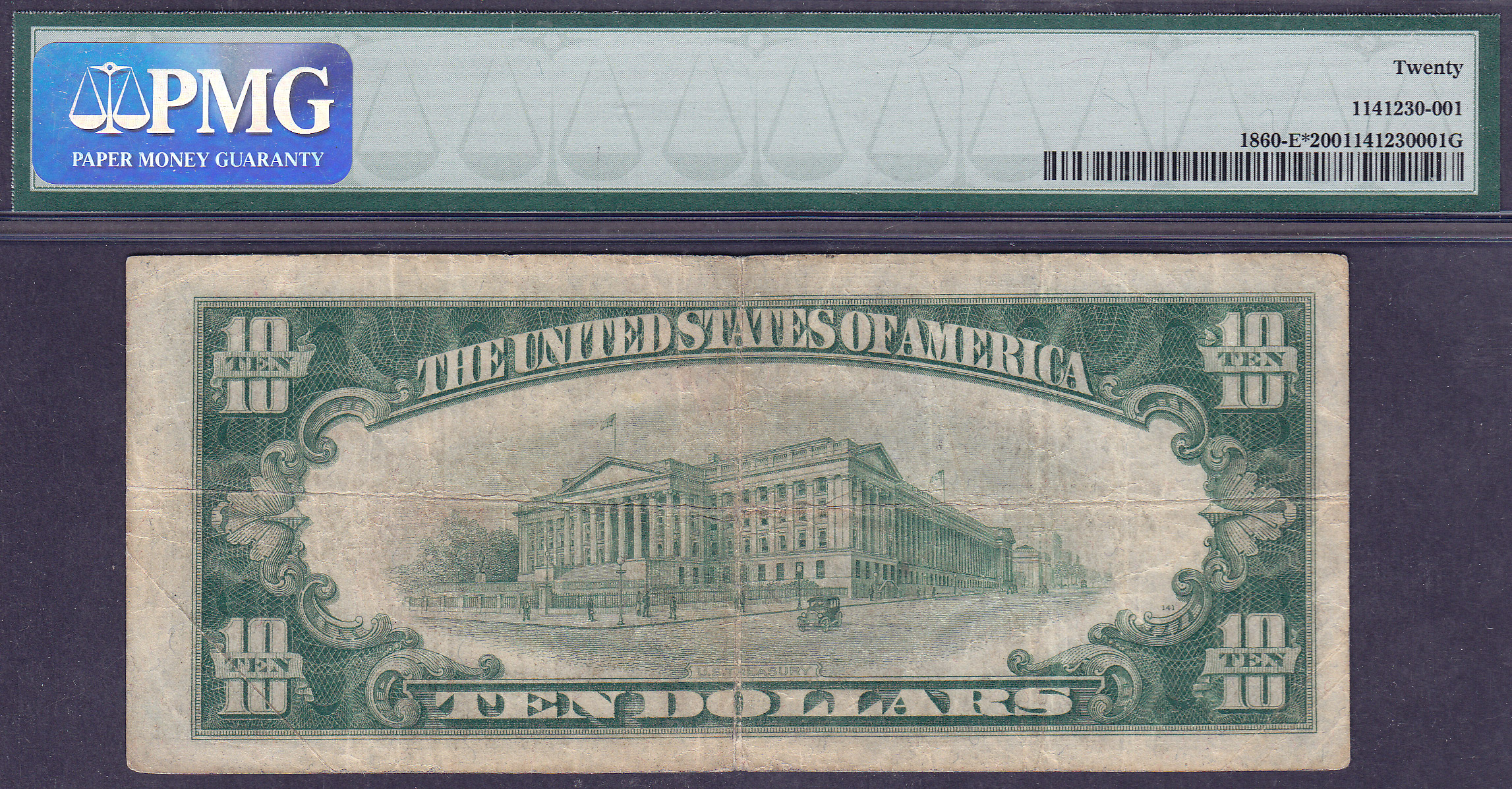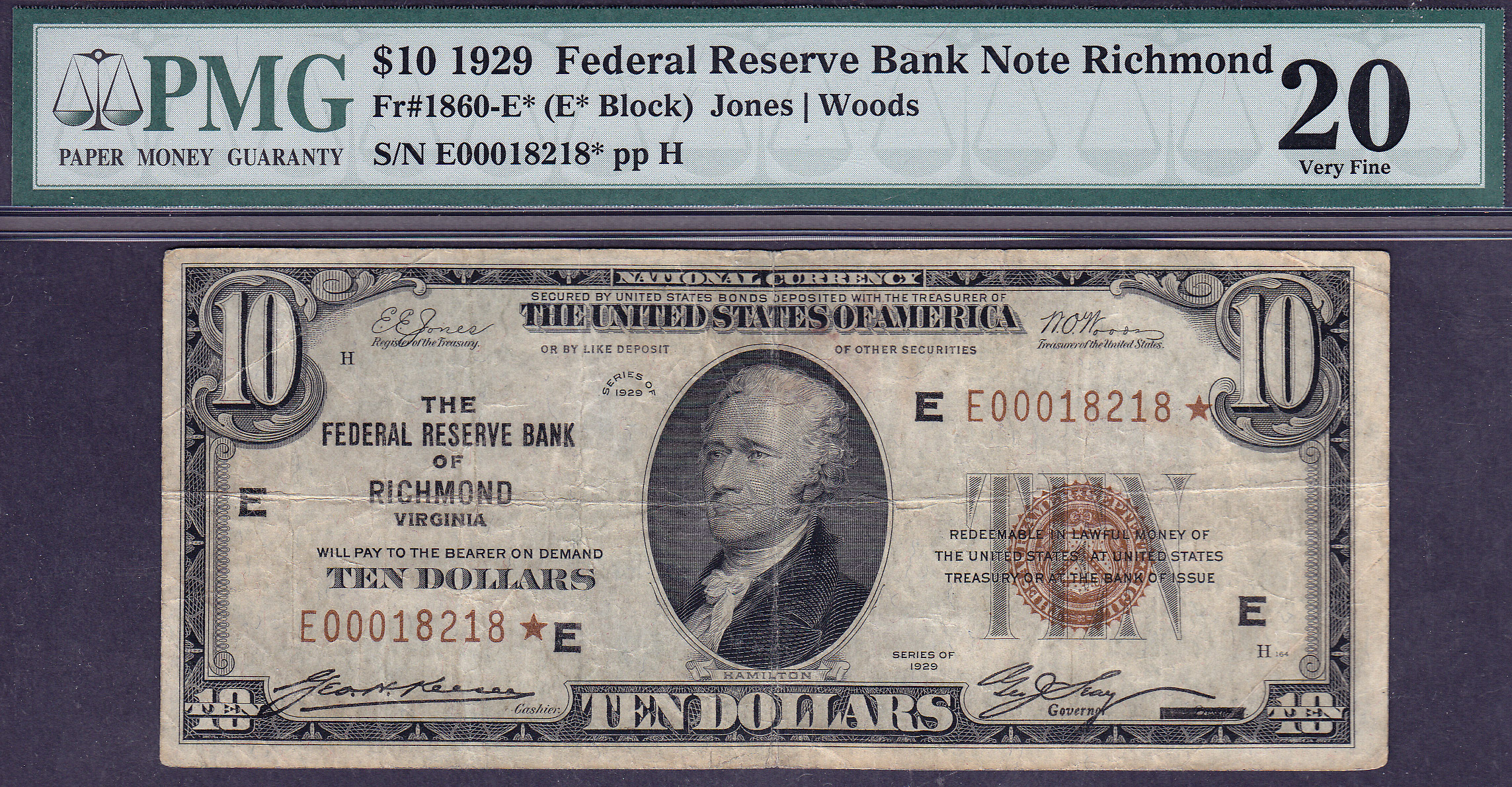 This 1929 $10 Richmond FRBN Star has a printing of 24,000 with only 23 known to have survived. There is one AU note with the rest being in VF or lower grade. Other than normal circulation, this is a no problem note. The serial number is E00018218* and is graded as a PMG VF-20.