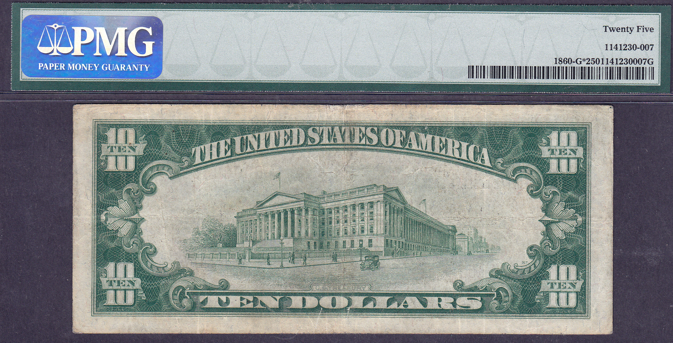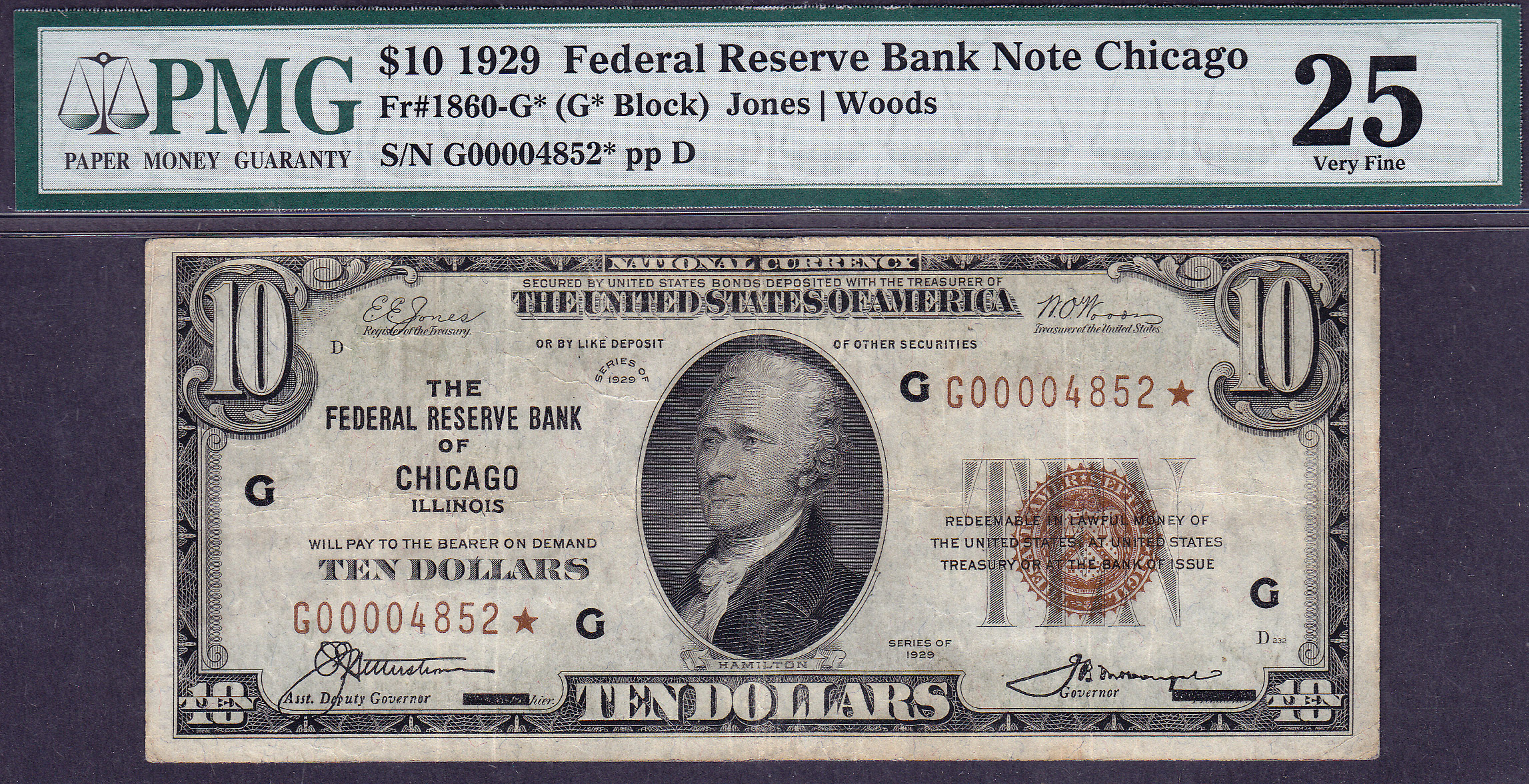 This is an Ex Cookson note that I purchased in November of 2003. There are only 19 $10 Chicago stars known. Most are in low grade with issues. This is a 1929 $10 FRBN star note from the Chicago district with serial number G00004852*. PMG VF-25. Nice centering with no rips, tears, pinholes or missing pieces. Pedigreed, Ex Cookson.