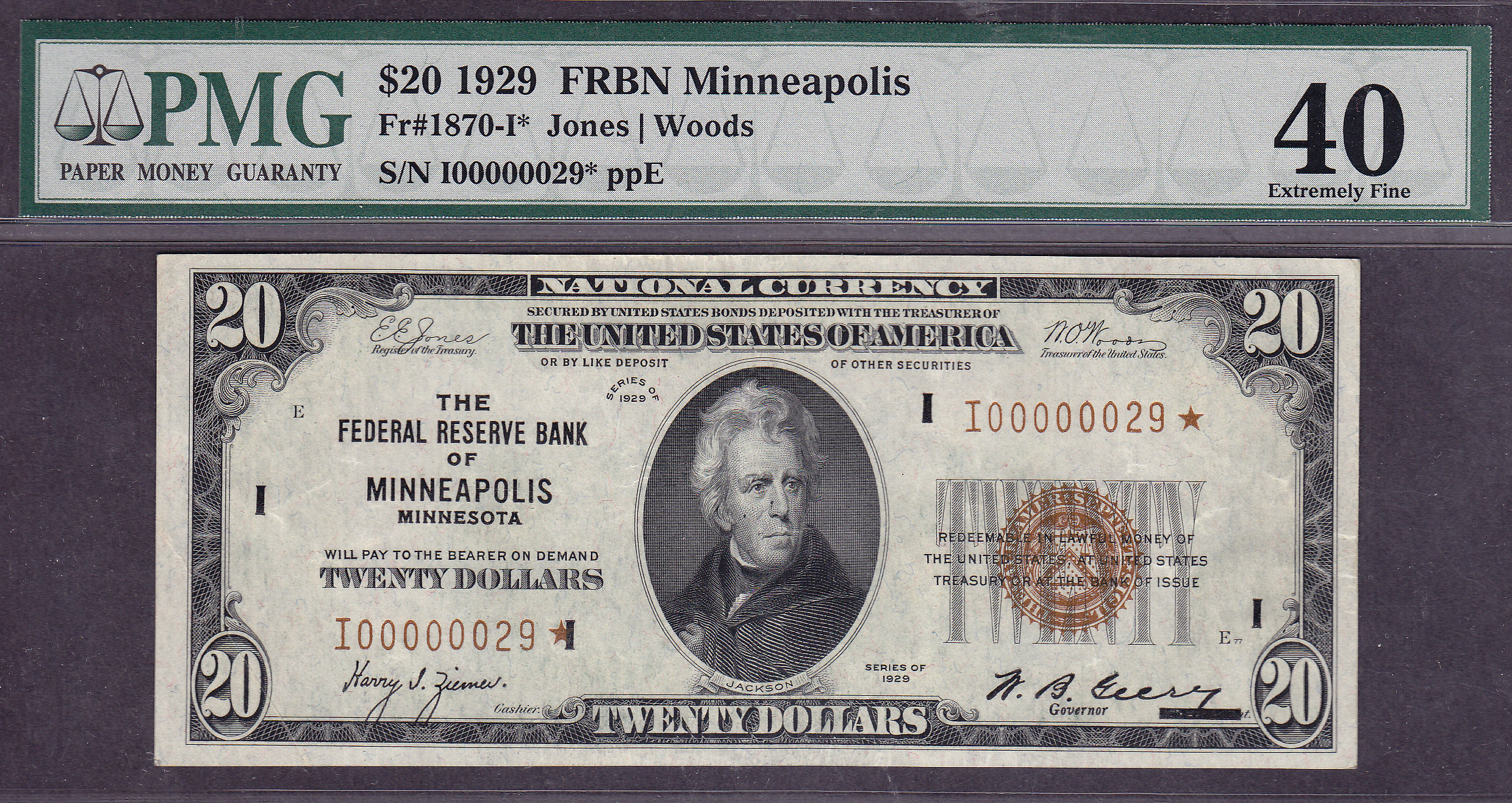 POP1/0 Finer...Here is a 1929 $20 Minneapolis FRBN 2-digit star note with the serial number of I00000029*. It has been graded as a PMG VF-40. Of the 12,000 printed only 22 have survived. This is an EX-Oakes and Jhon E Cash pedigreed note. This is also the lowest serial number known.