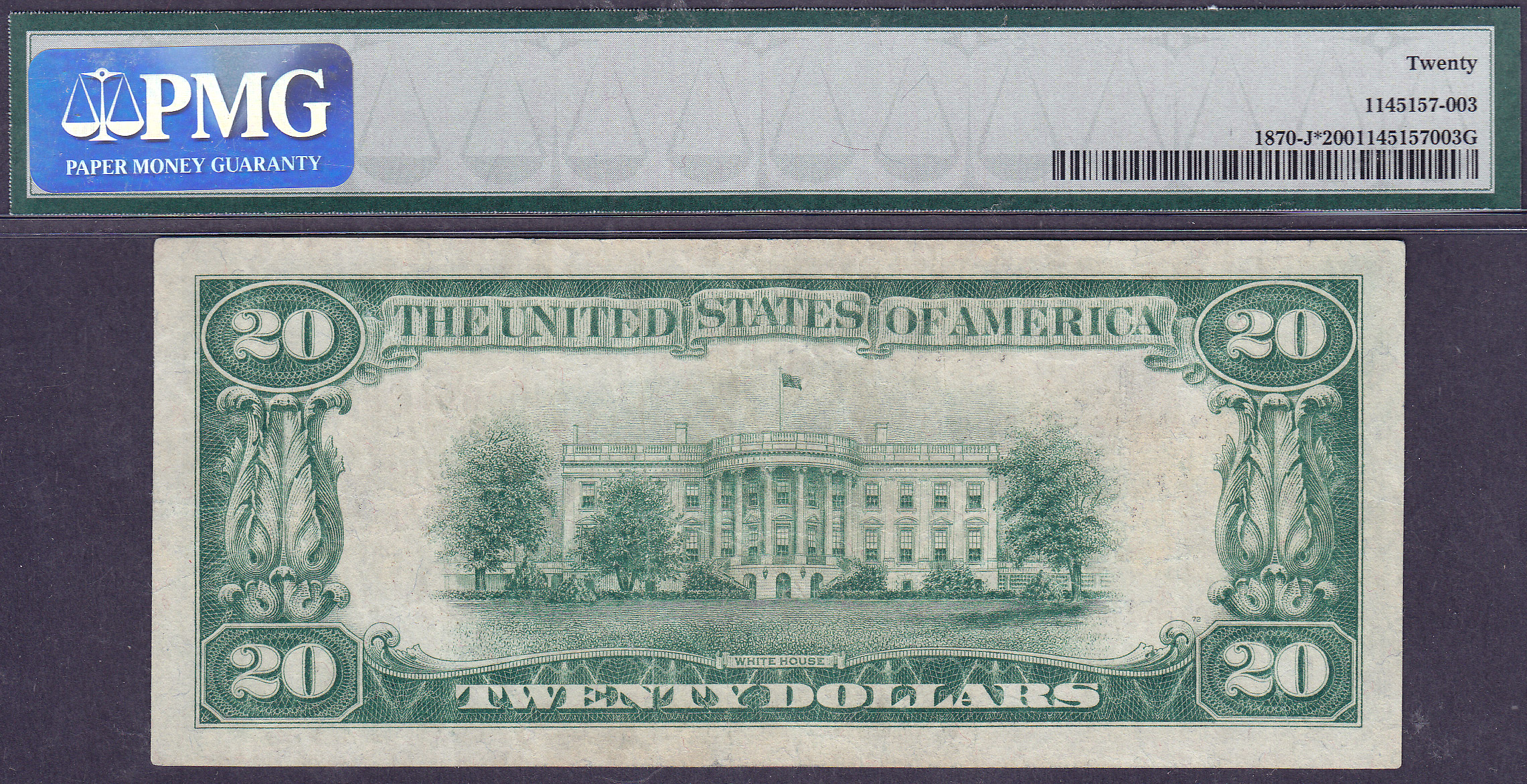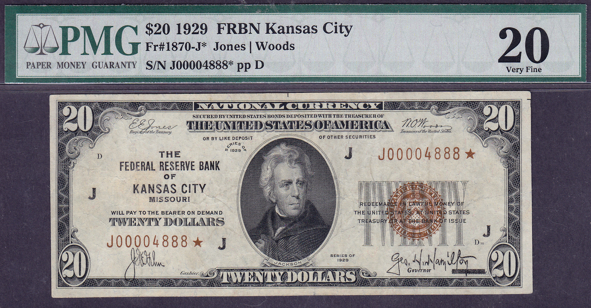 This is a 1929 $20 FRBN star from the Kansas City district. Of the 24,000 printed only 24 have survived. PMG has graded only one note higher than this one and it is a PMG VF-20. This is the second finest graded by PMG. Most of the surviving 24 notes are in Poor to Very Good Condition. This note is definitely better than a VF-20 grade. Look at the large scans and you be the judge for your self.