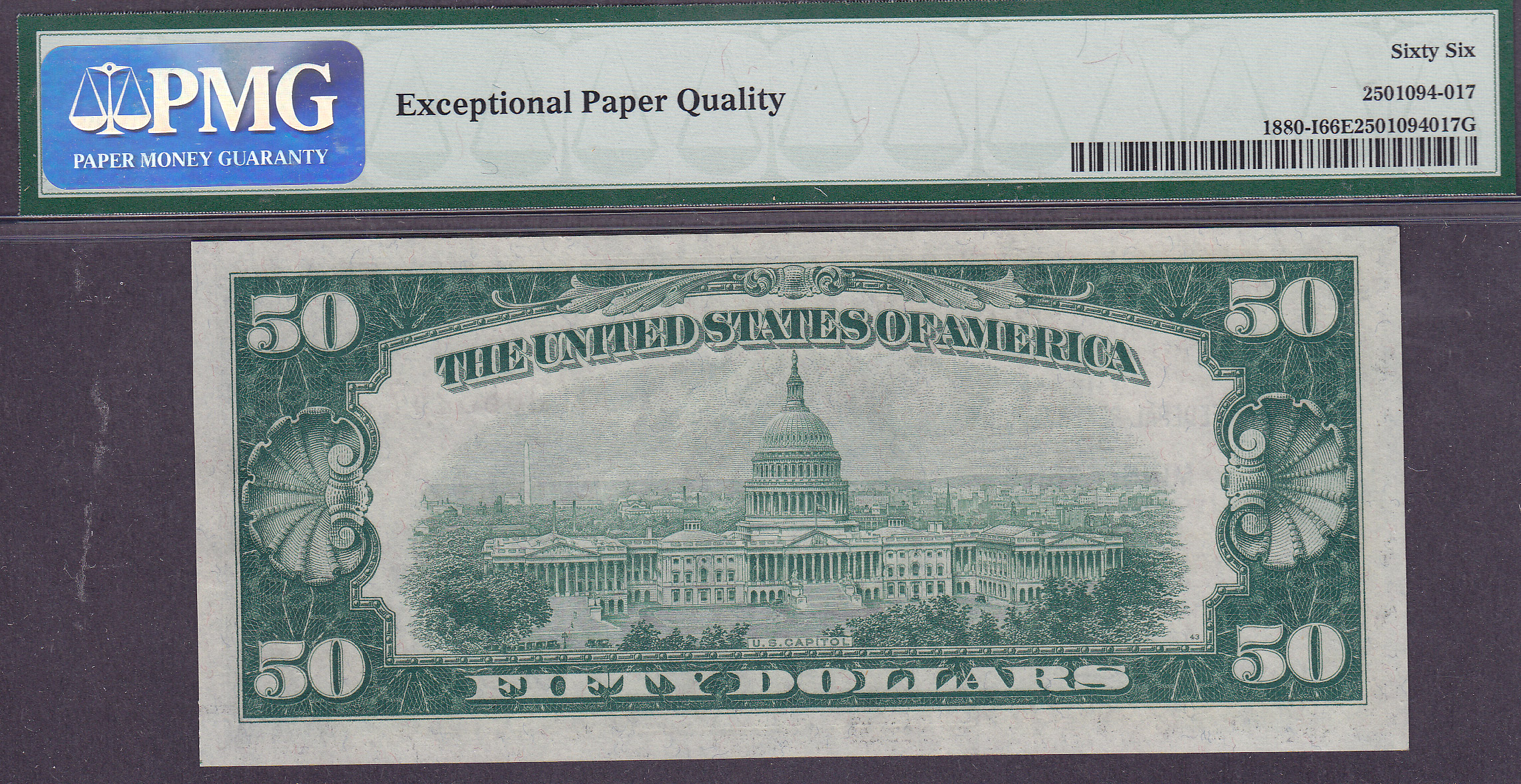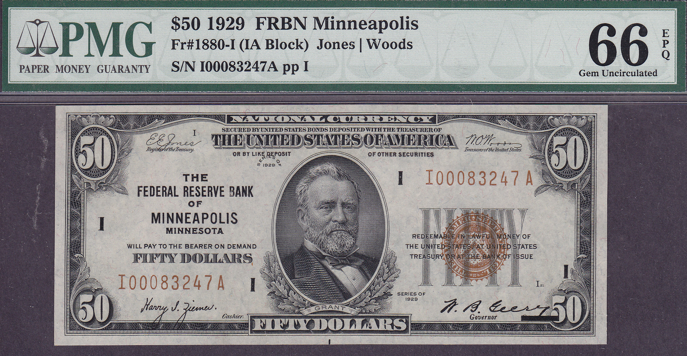 Here is the Finest known 1929 $50 FRBN from the rare and tough district of Minneapolis that exist in a PMG holder as of Sept 2010. It is a 1929 $50 Minneapolis FRBN in a PMG -66EPQ Holder. The serial number is I00083247A. You will not find another one anywhere in or near this grade. This is destined for the finest collection.