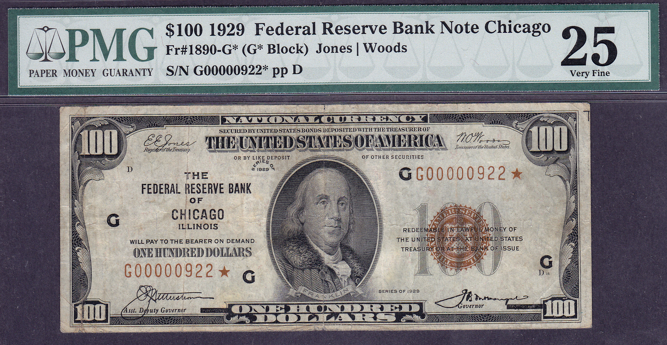 Here is a 1929 $100 FRBN Chicago Serial Number G0000922* Note. There are only 14 $100 1929 FRBN Chicago Star notes known. This is a problem free note and is the 5th finest known of the 14 known. Its real hard to locates these notes nowadays, especially with the increased interest in 1929 FRBN stars. The collectors are finally realizing the rarity of the few remaining.