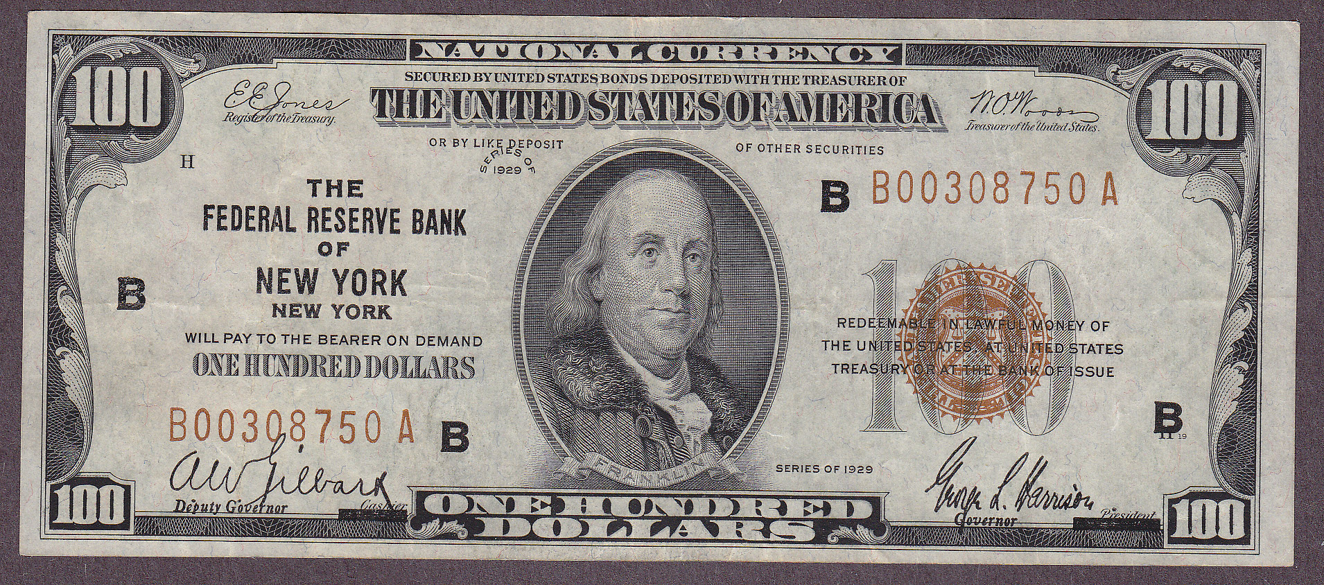 A nice circulated example of a 1929 $100 Federal Reserve Bank Note from the New York district. There are no rips, tears of pinholes. A solid VF with no soiling. The serial number is B00308750A. No rips, tears or pinholes. Never pressed on cleaned, all original.