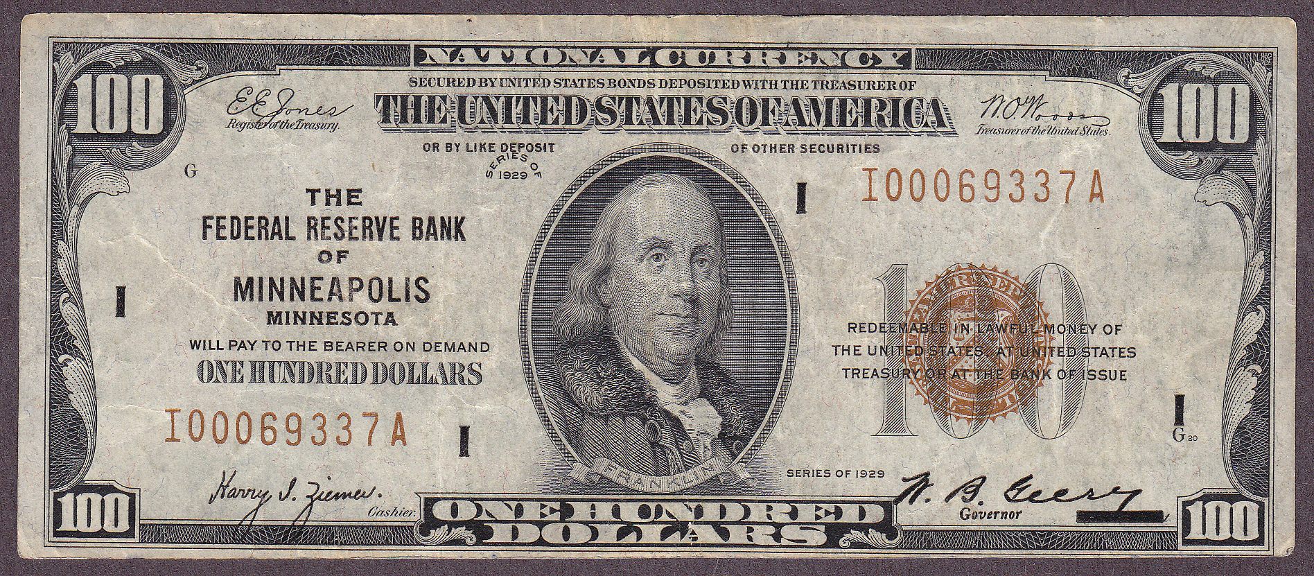 A nice circulated example of a 1929 $100 Federal Reserve Bank Note from the ever tough Minneapolis district. There are no rips, tears of pinholes. A solid VF with no soiling. The serial number is I00069337A . Minneapolis is always one of the key districts in this series.