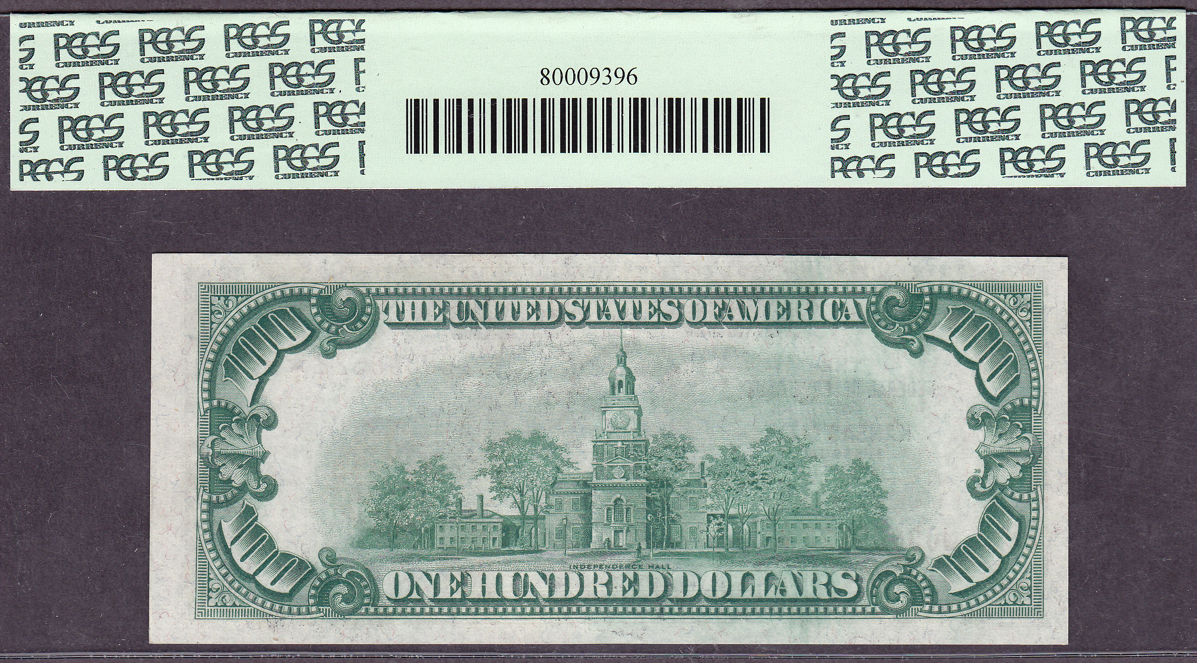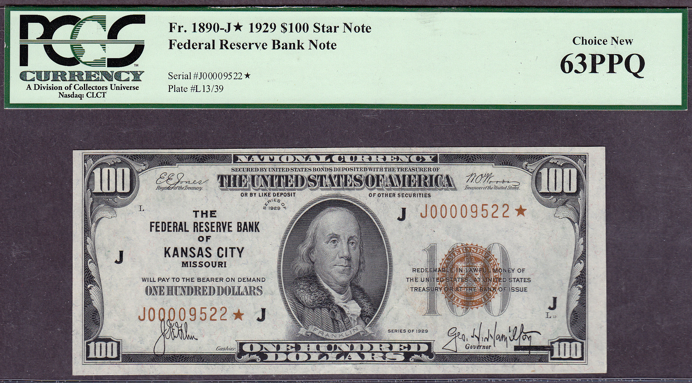POP 2/1 finer. This 1929 $100 FRBN Star is one of only a few Uncirculated $100 Kansas City Stars known. There is one graded by PCGS that is in higher grade and it is a PCGS-64PPQ. If the face had a bit more top margin it could have received as high as a 67PPQ grade. For the collector looking to put together a Uncirculated set in this Series, this is one to consider. The serial number is J00009522*.