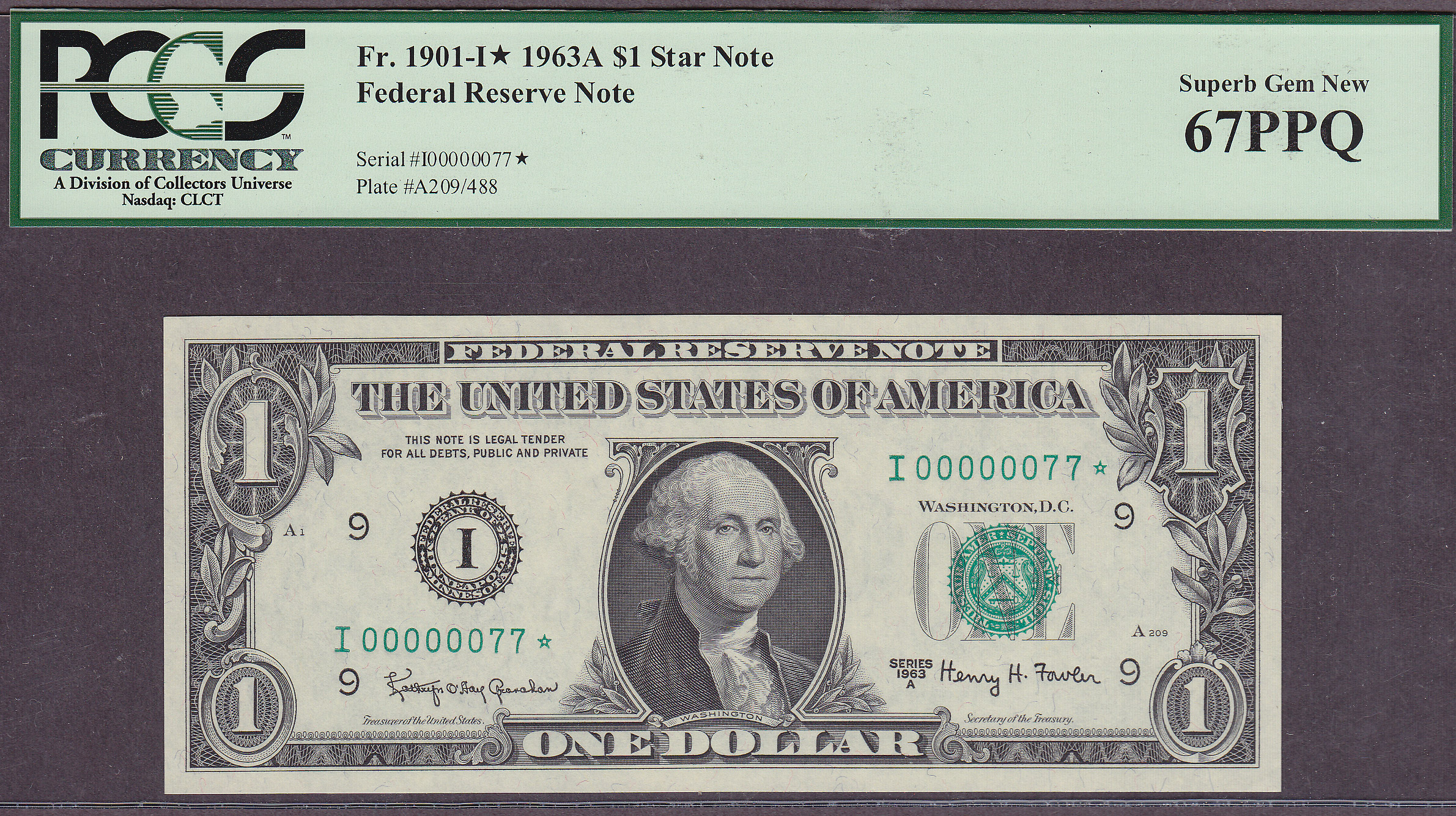 A really cool RADAR or solid serial numbered 1963A $1 Federal reserve Note with the super low two dight serial number of I00000077*. It has been graded as a PCGS-66PPQ, a Superb GEM.
