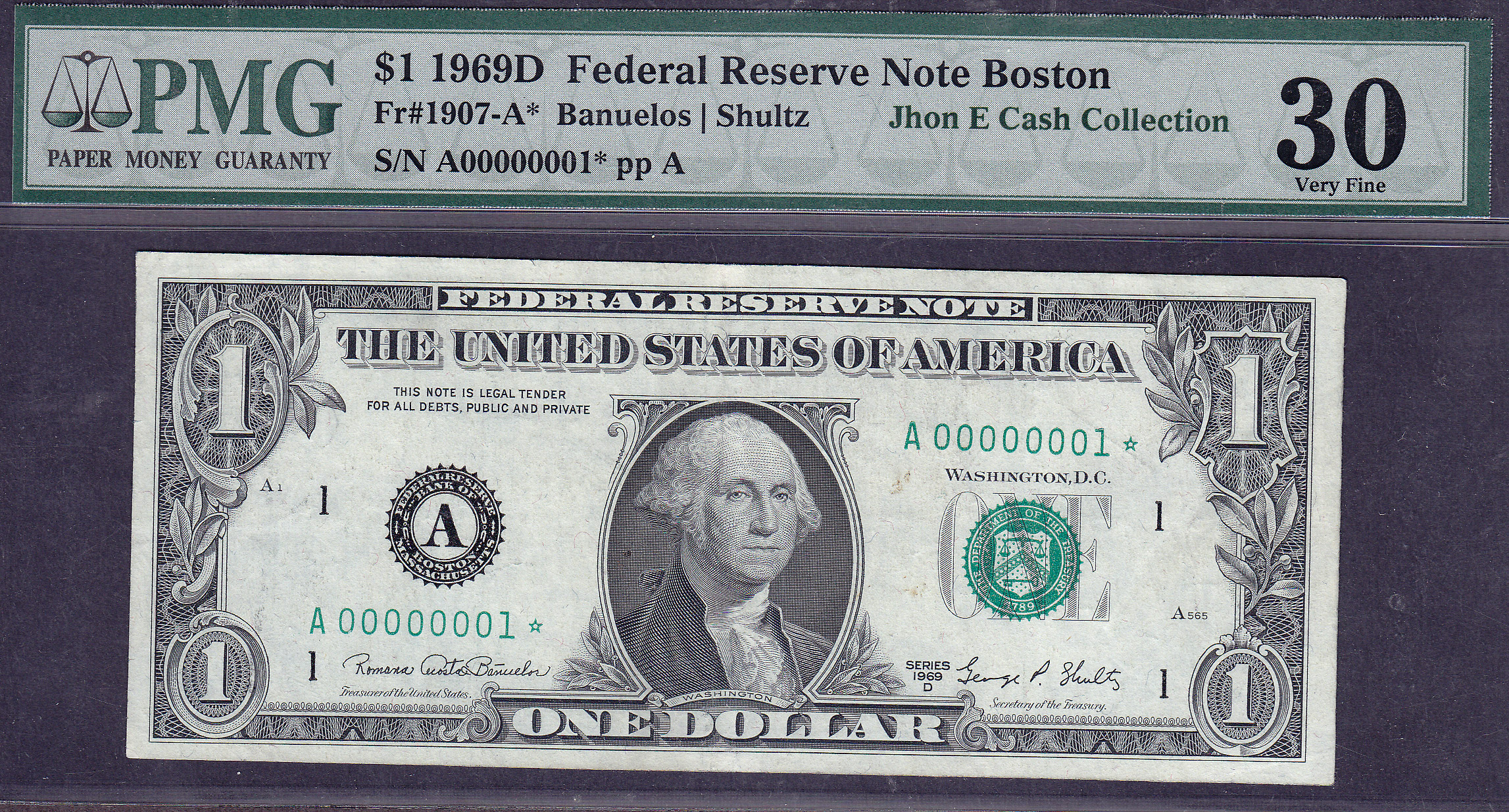 This is the very FIRST 1969 $1 note printed for the whole series...and it a star! How cool is that. You can tell you friends that you own a unique piece of Americana history. This is about as lowest serial number as you can get, and guess what...it also is a serial number one star note. This note is a 1969 $1 FRN with the serial number of A00000001*. This is one of the stars in the Jhon E Cash serial #1 stars collection. Destined for the finest collections in the United States.