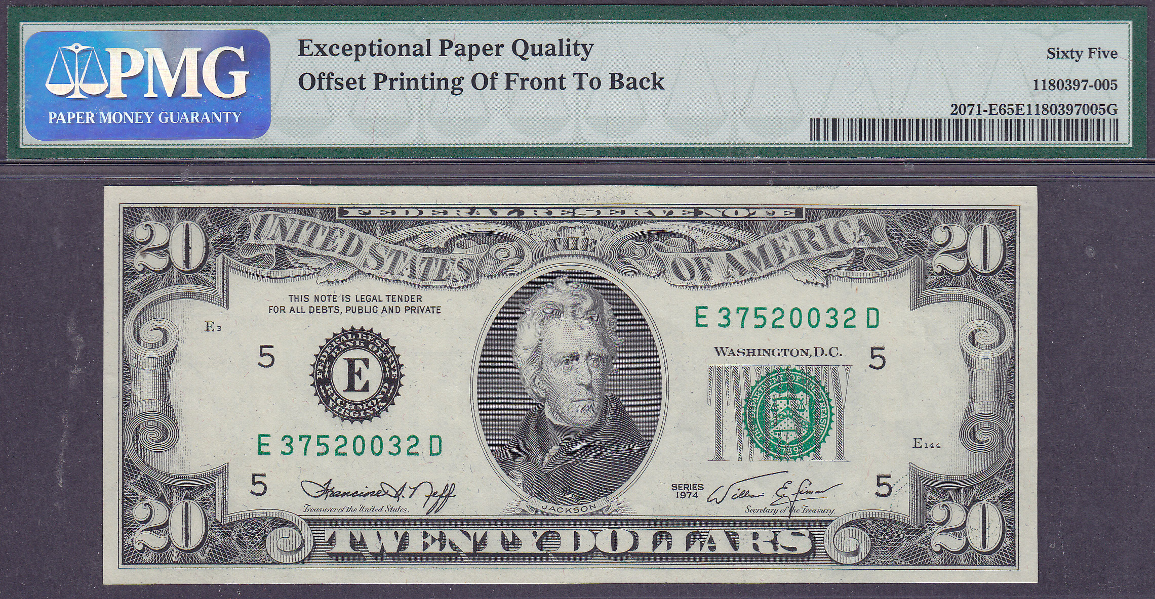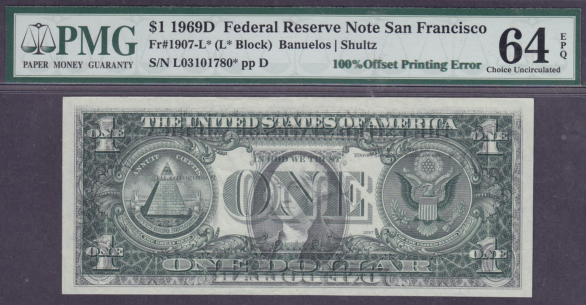 RARE DOUBLE ERROR! F2B Star error! That means that this is a Face to Back (F2B) 100% offset Star error note...and a star at the same time. I have seen many F2B and Back to Face (B2F) offset errors, but I have never see one that is a 100% F2B or B2F offset note that is also a replacement note or star note as well. Chances are neither have you. This GEM example is one rare puppy and should be heavily considered by all you error collectors. You may not get another opportunity to acquire one like this for many years. The serial number is L03101780*. This note is in a PMG-64EPQ Holder.