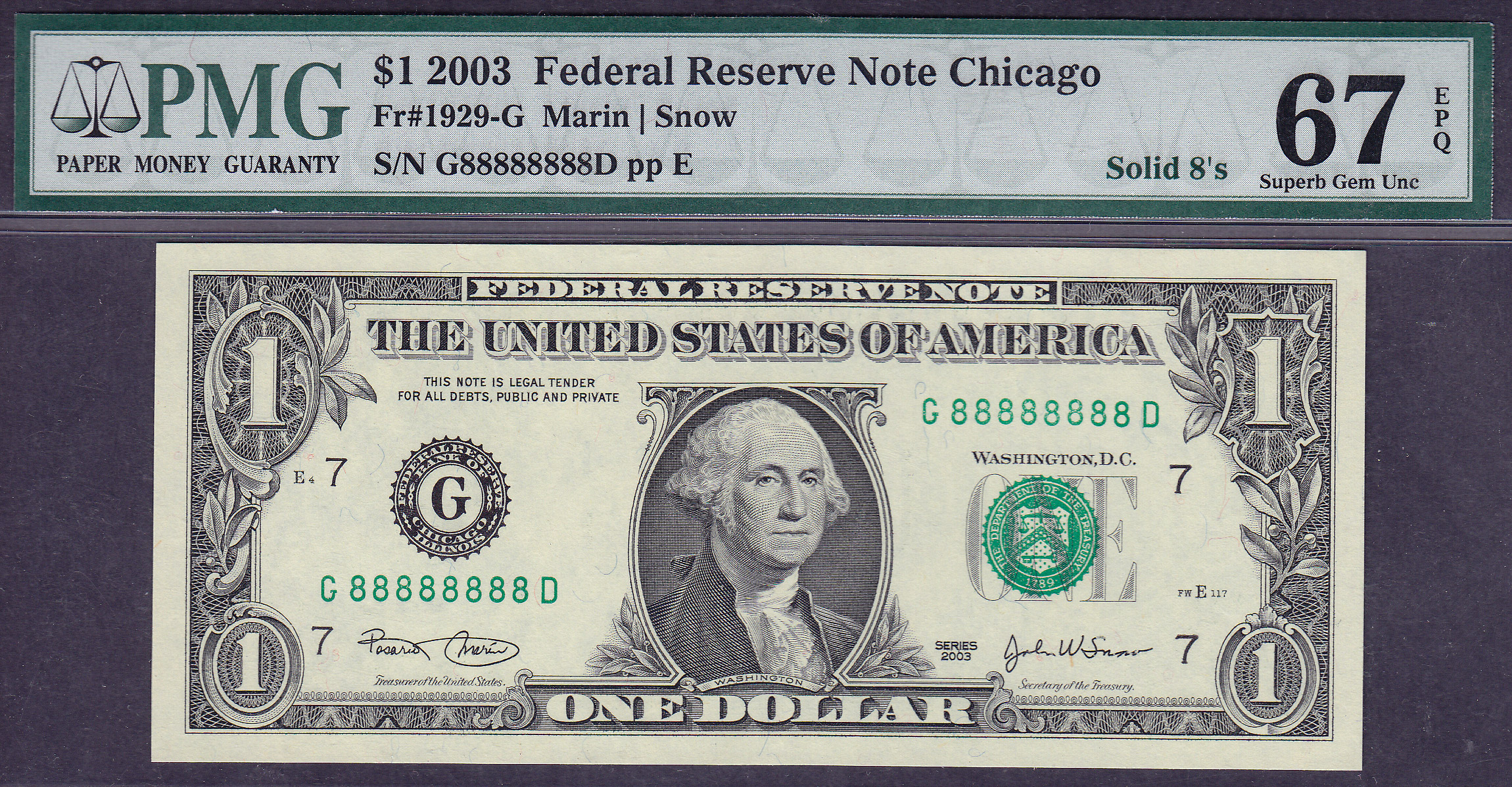 This is a "Stunning Note"! It is a 2003 $1 FRN from Chicago with the solid serial number of G88888888D. It has been graded as a PMG Superb GEM-67EPQ.
