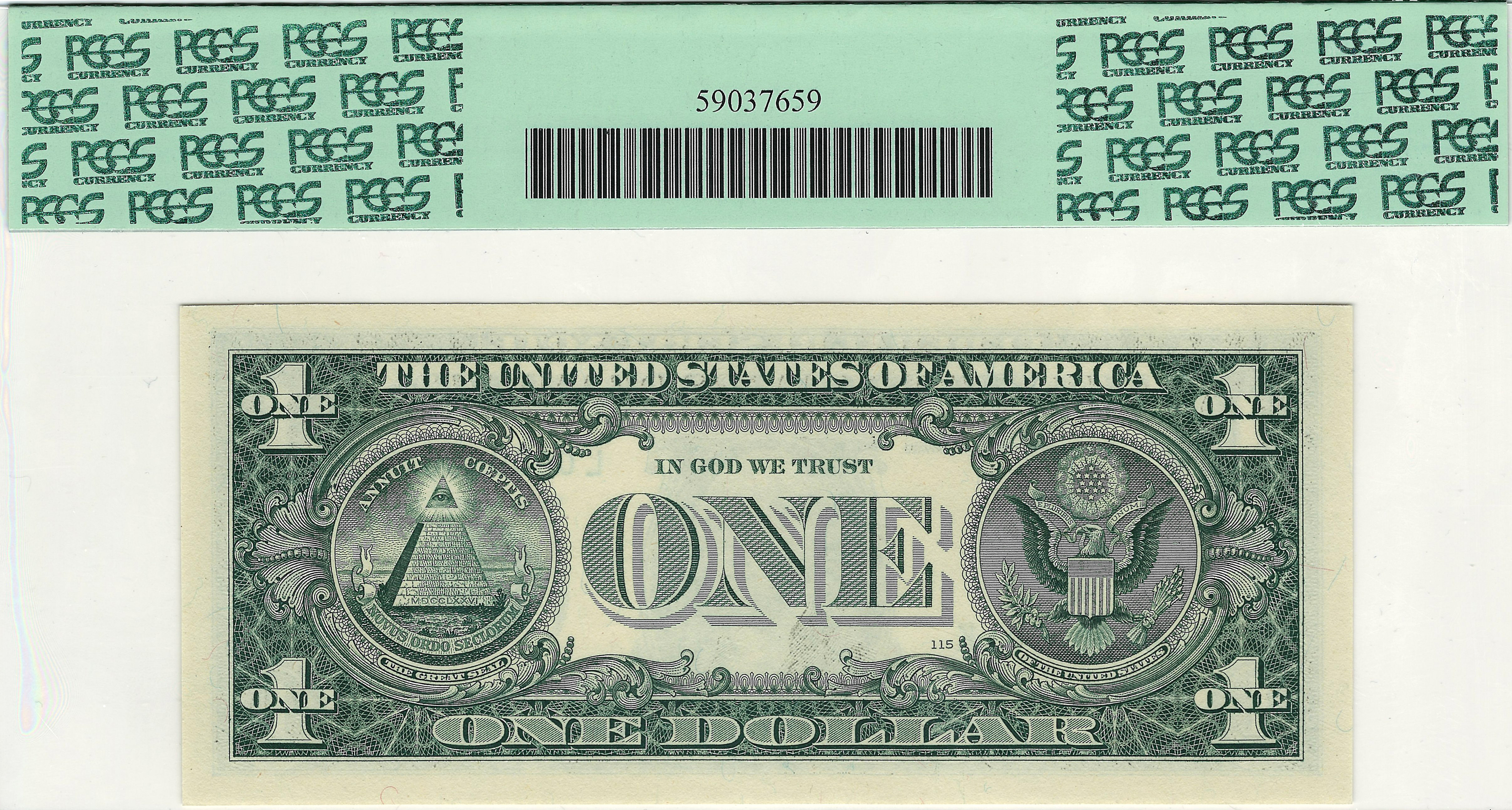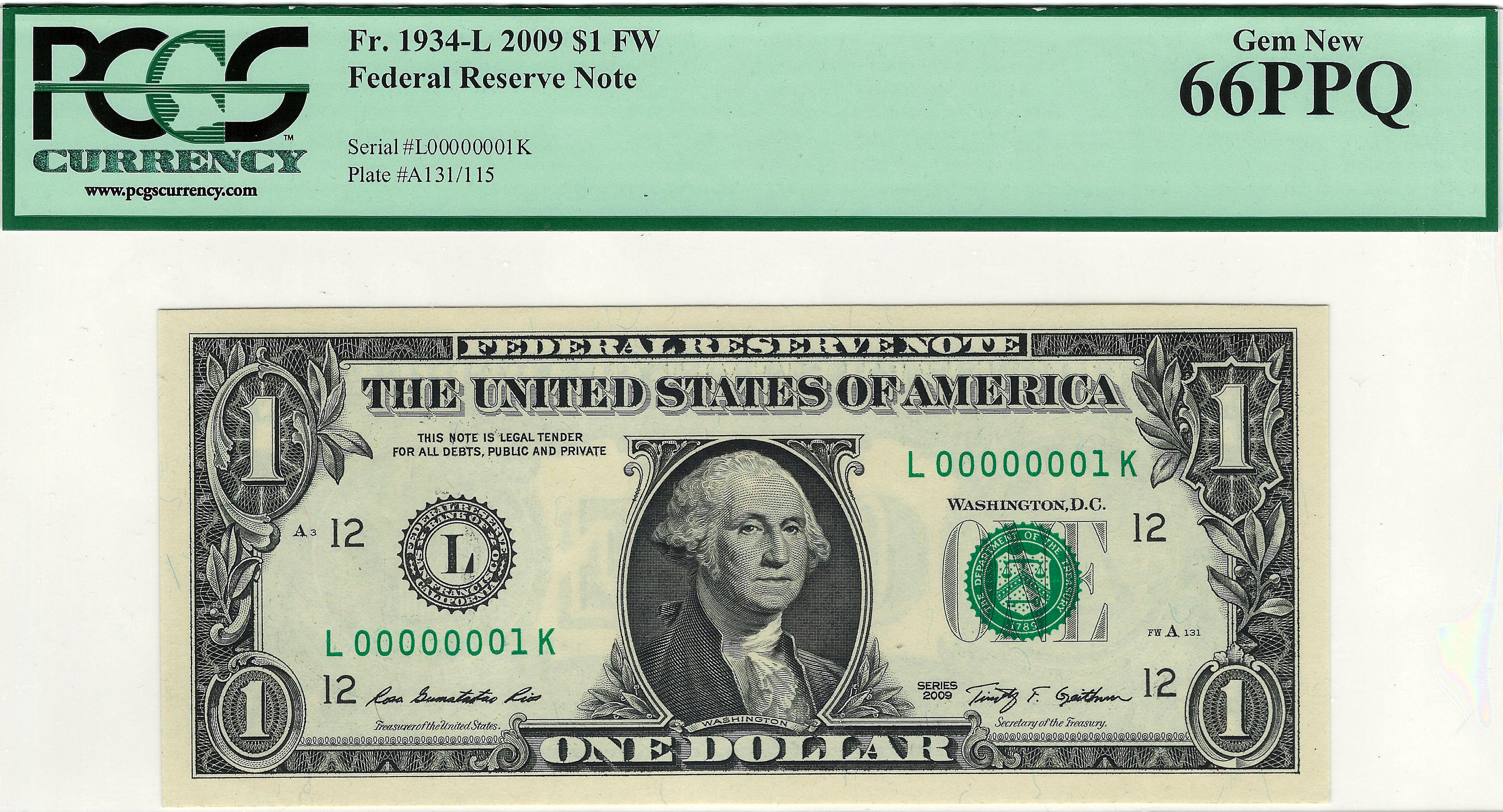 This is the highest grade of all the serial number one notes I have ever seen. This is a 2009 $1 FRN from the popular San Francisco District. The serial number is L00000001K. When I first bought this note raw I really thought I would get a PCGS-67PPQ grade. I do not know why because look closely at the perfect and even board walk margins on both sides. There are no ink smears on the serial numbers as is the case for quite a few of them. The last one I saw in a Heritage auction sold for almost $7,000 with the juice. Here is one for quite a few dollars less.