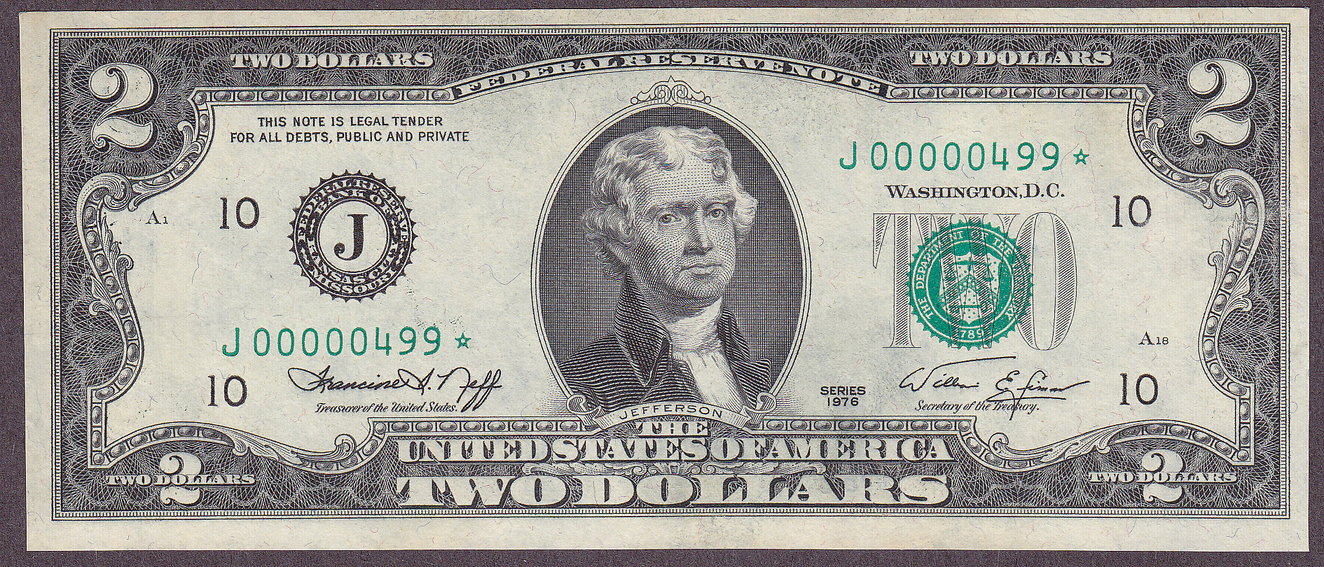 Check out this 1976 $2 Federal Reserve Note from the rare Kansas City district. Any one who knows about 1976 $2 FRN stars knows that Kansas City stars are a key district and very rare. It is also a cool low three digit serial number of J00000499*. There are no problems at all with this note. I just found it in the back of my safety box and have not had a chance to get it graded yet. I will submitt it at the next show I attend. I purchased this nite at a Cincinatti currency show in October of 2003.