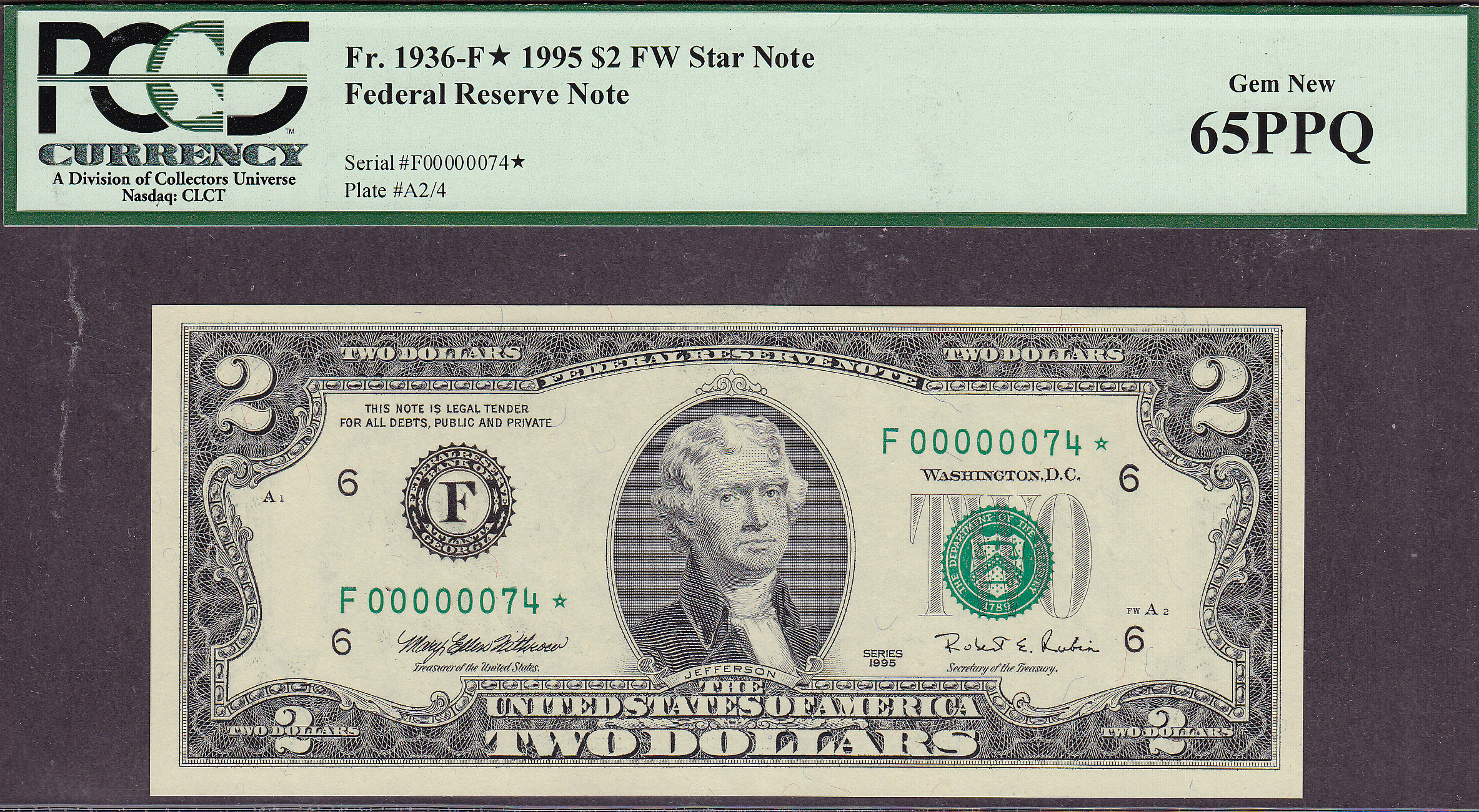 This note is part of a large collection of single and double digit 1995 $2 stars. All of them are graded by PMG or PCGS and most are in grades from 65 to 67EPQ/PPQ. If you have a favorite serial number you collect or want a two digit $2 star for your birthday age or year, this is your chance to get one. Check out all of the numbers. Im offering all of them below my cost so you might want to take advantage of this sale.