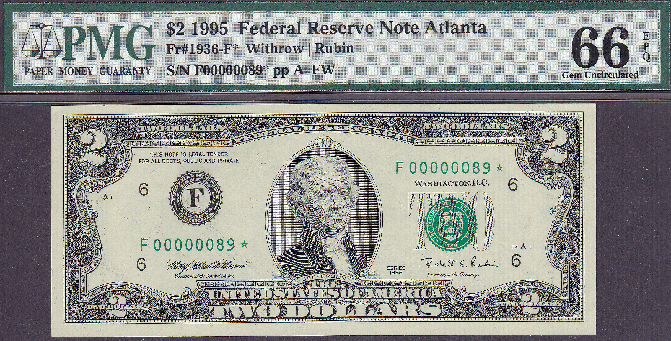 This note is part of a large collection of single and double digit 1995 $2 stars. All of them are graded by PMG or PCGS and most are in grades from 65 to 67EPQ or PPQ. If you have a favorite serial number you collect ot want a two digit $2 star for you birthday age or year, this is your chance to get one. Check out all of the numbers. I''m offering all of them below my cost so you might want to take advantage of this sale.
