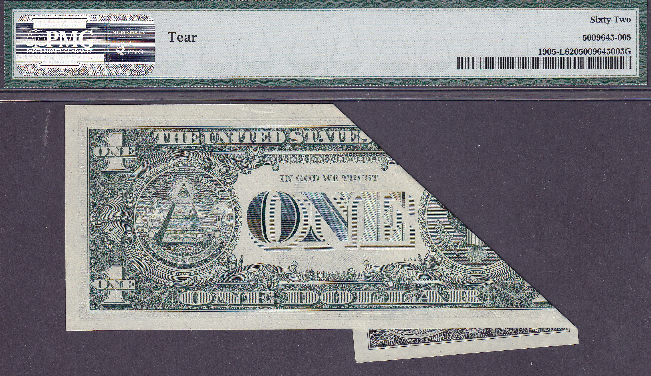 I just purchased a lot of major errors with super eye appeal and this is one of them. this is a 1969B $1 FRN from San Fran. As you can see this is one hell of a foldover. You can see that it got folded after the first print the second print the third print (seal and serial numbers) show up on the back of the bill. The fold occures once again after the cutting process. This is one dramatic error. I do not see any tears on this bill and it is in a PMG holder. I completely disagree with this grade and comments.