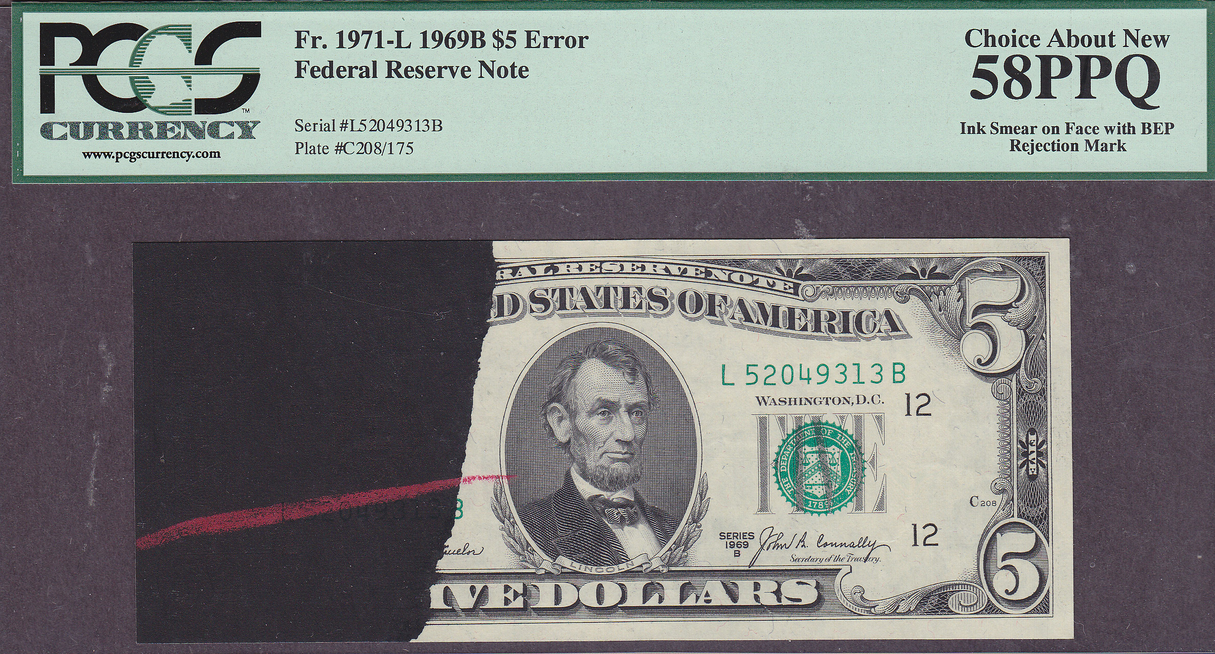 Fr.-1971 1969 $5 San Fran. (Major Ink Smear Error) Ser. L52049313B PCGS 58 PPQ