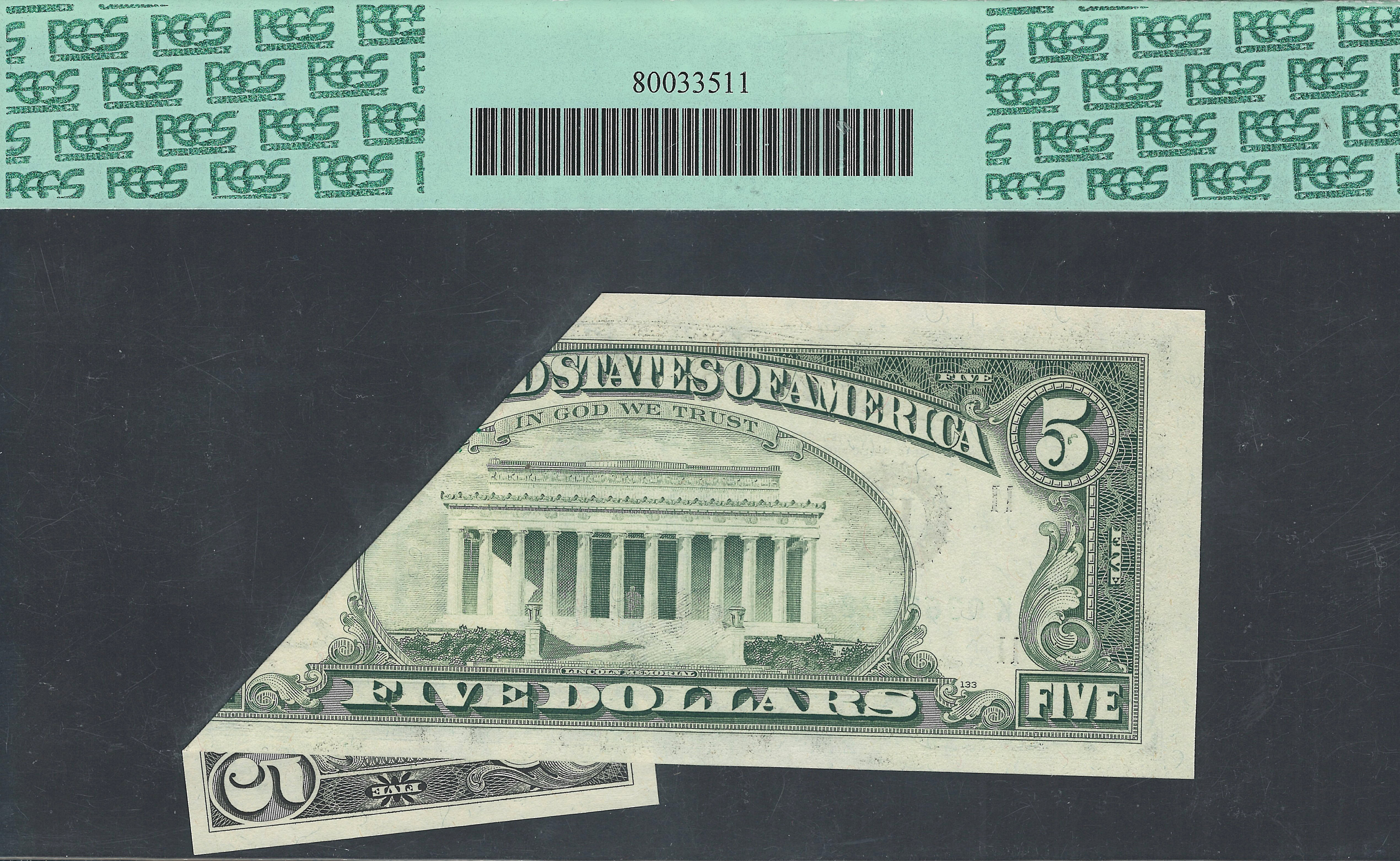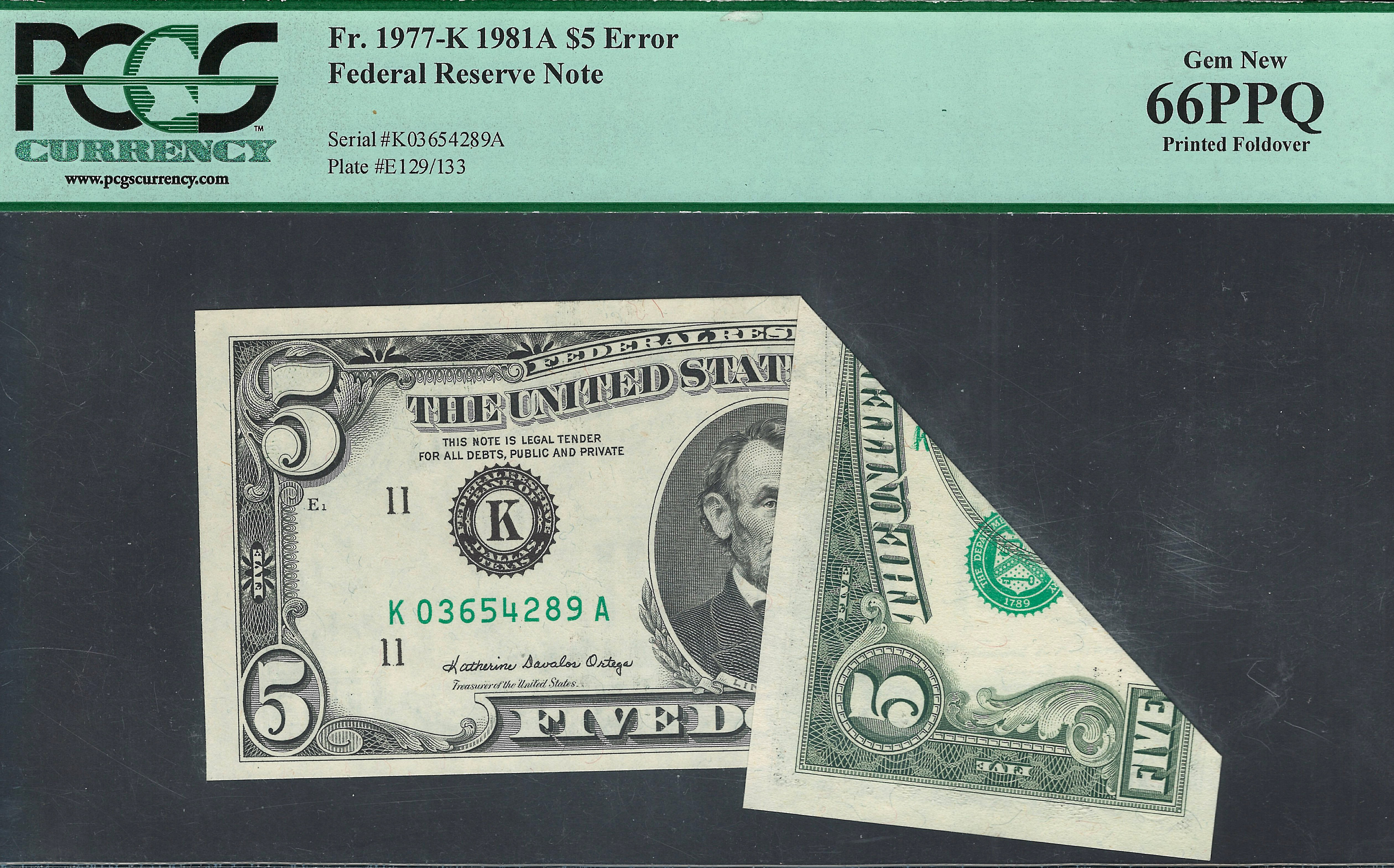 This is one wild fold over. It is a 1977 $5 Dallas FRN with a 50% fold over Error. The serial no. is K03654289A and it resides in a PCGS 66PPQ holder. This is part od a six note error collection I purchased at the CPMX show in Chicago. All of them were nice exotic errors. I buy and sell a lot of error notes and you hardly ever find one with this nice with a major foldover in a superb GEM66PPQ grade. This will end up in a high grade major error collection. It is defiantly priced to sell.