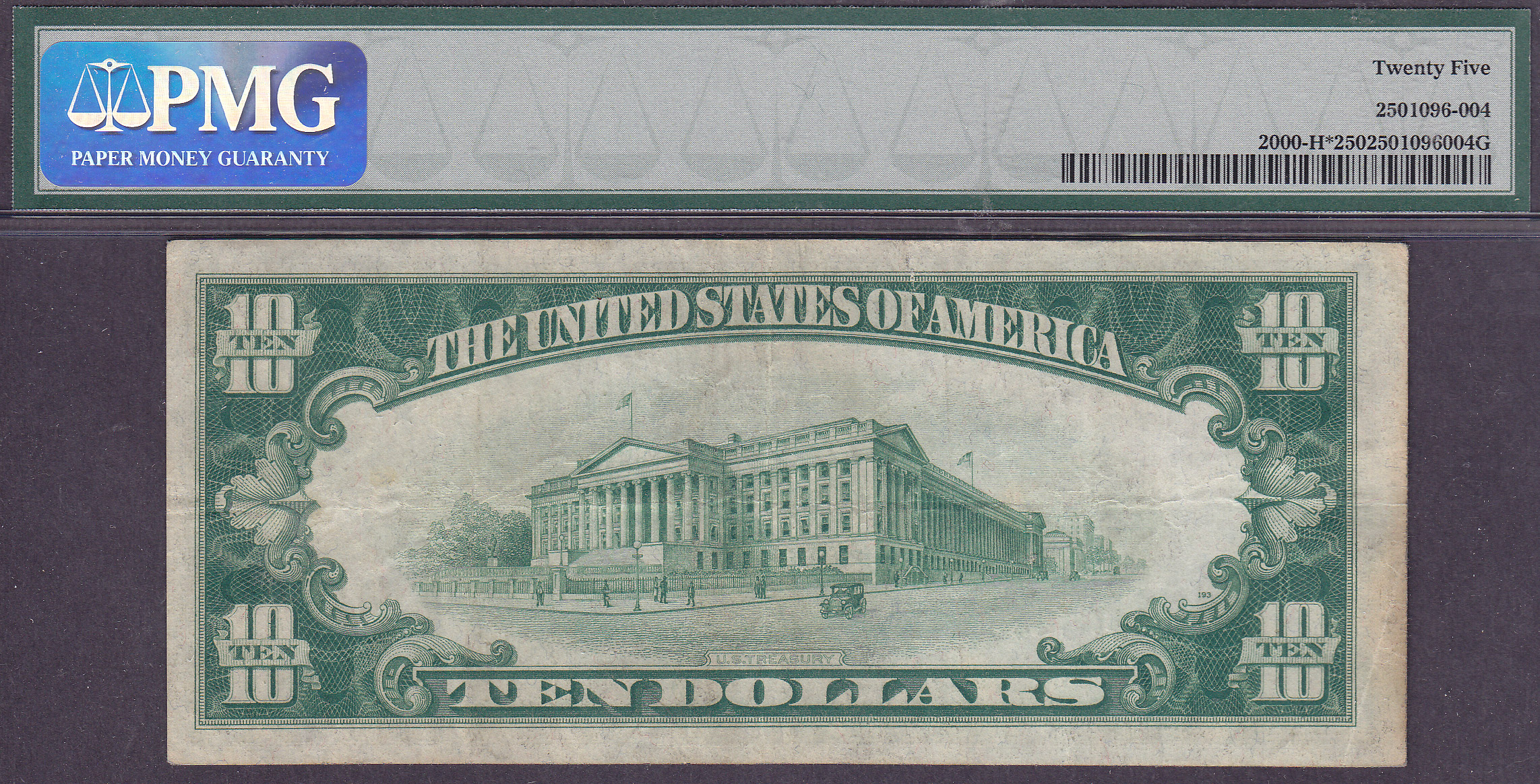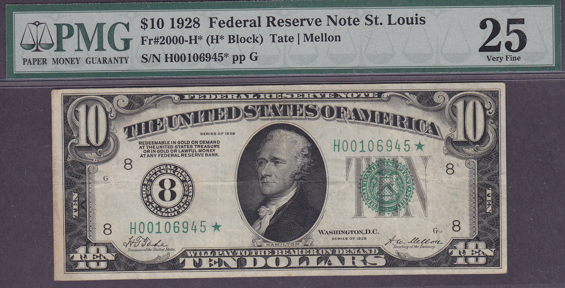 Here is a 1928 $10 FRN star from St Louis. The serail number is H00106945*. It is in a PMG VF-25 holser. The plate numbers are GG12/193.