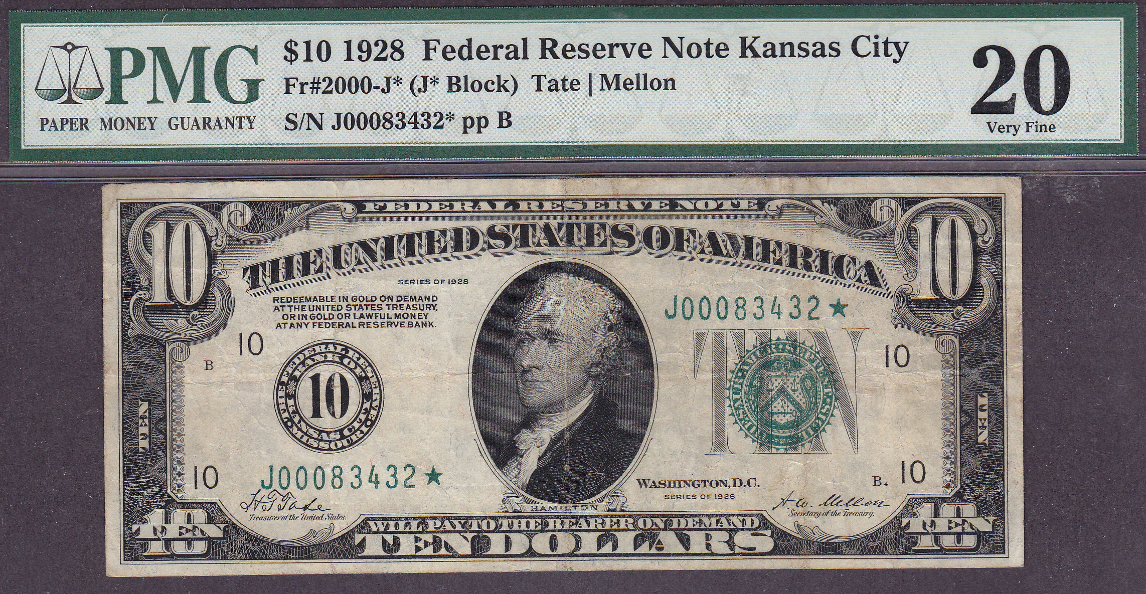 Fr.-2000* 1928 $10 Kansas City FRN Ser. J00083432* PMG-20