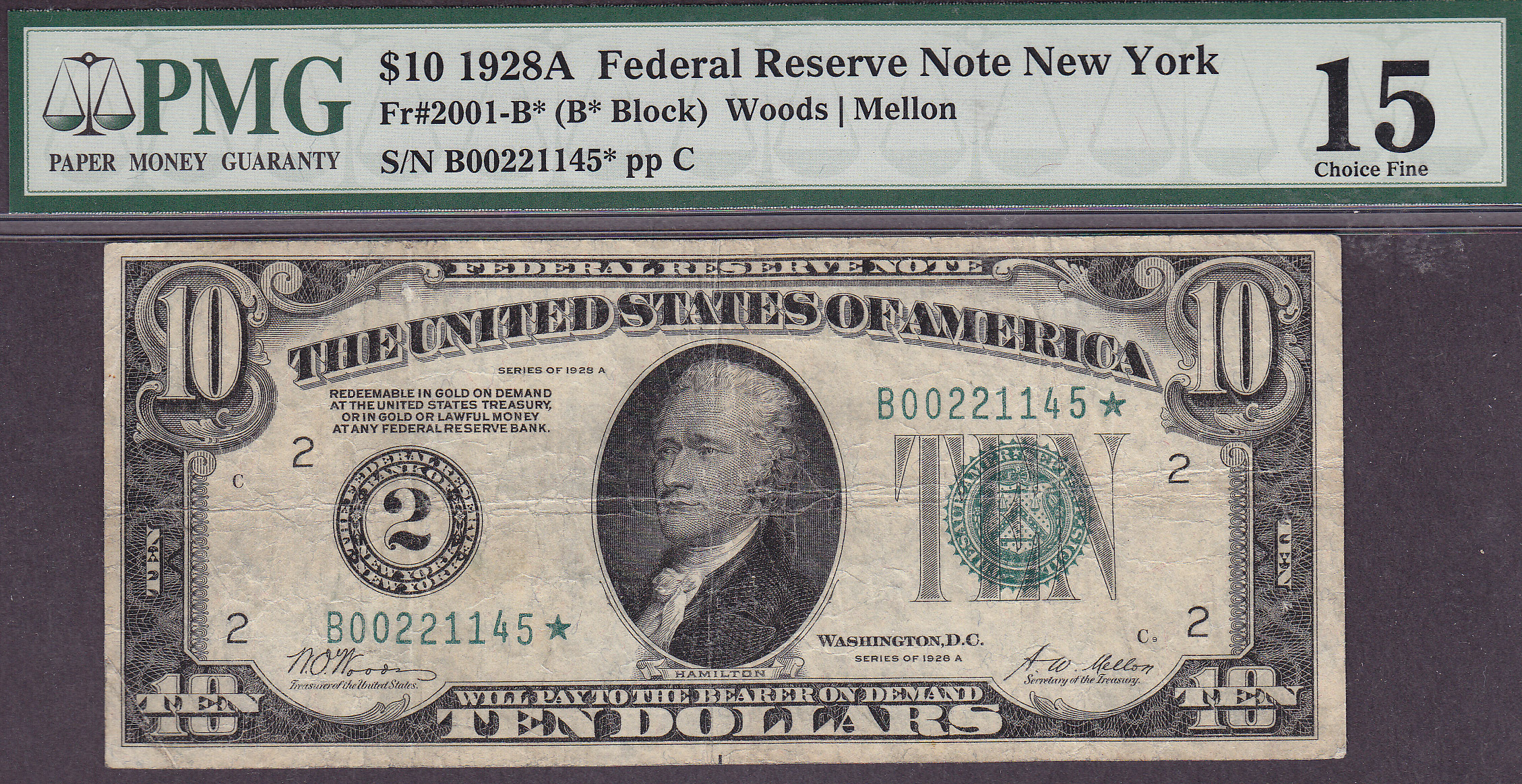Fr.-2001B* 1928-A $10 New York FRN Ser. B00221145* PMG-15