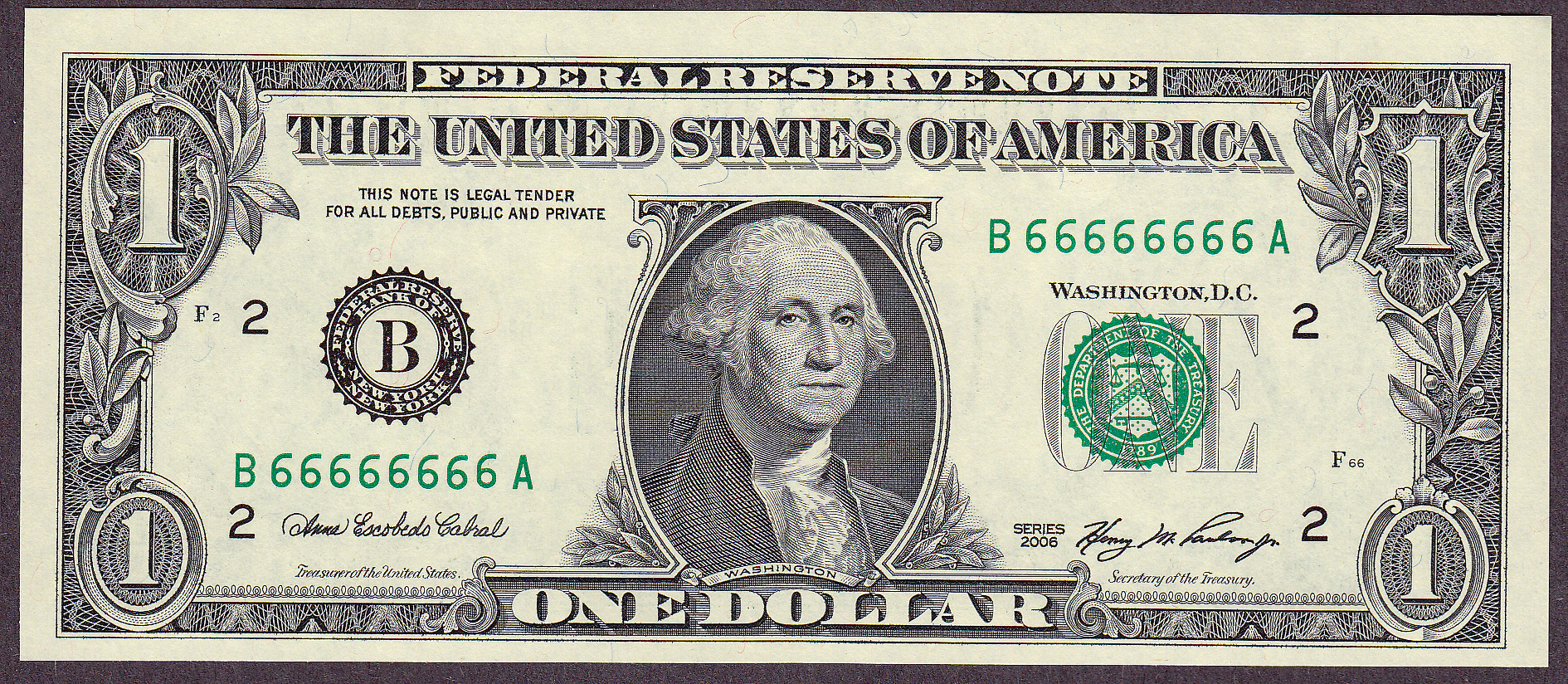 Here is a set of 10 2006 $1 FRNs form the New York district. I just bought this set. They are all UNCS. The serial numbers range from BB66666660A to B66666669A. The solid six, serial number B66666666A is included with this set. Take it with you, now! This note is in a PCGS-64PPQ holder.