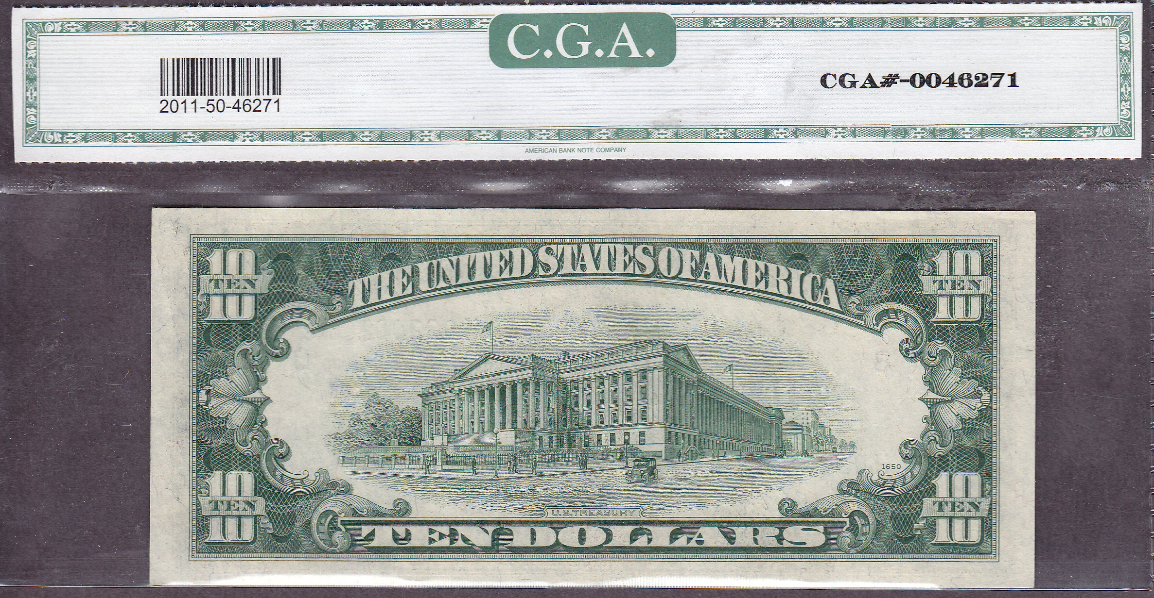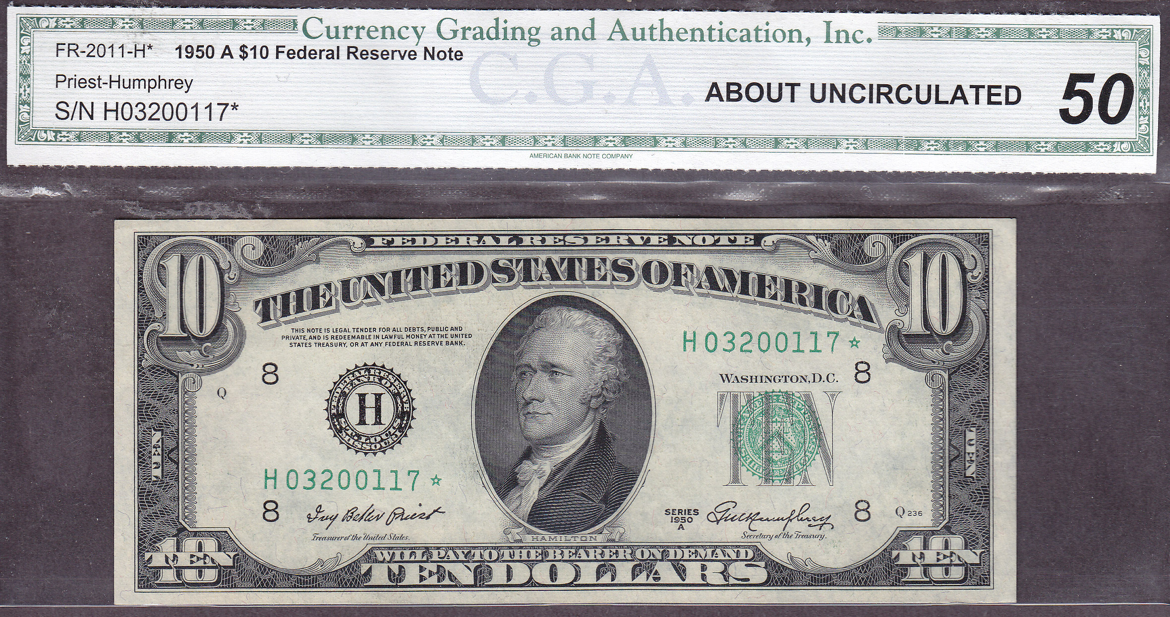 Here is a 1950A $10 FRN star from St Louis. Tt has been graded as aa CGS-50. No rips, tears or pinholes.