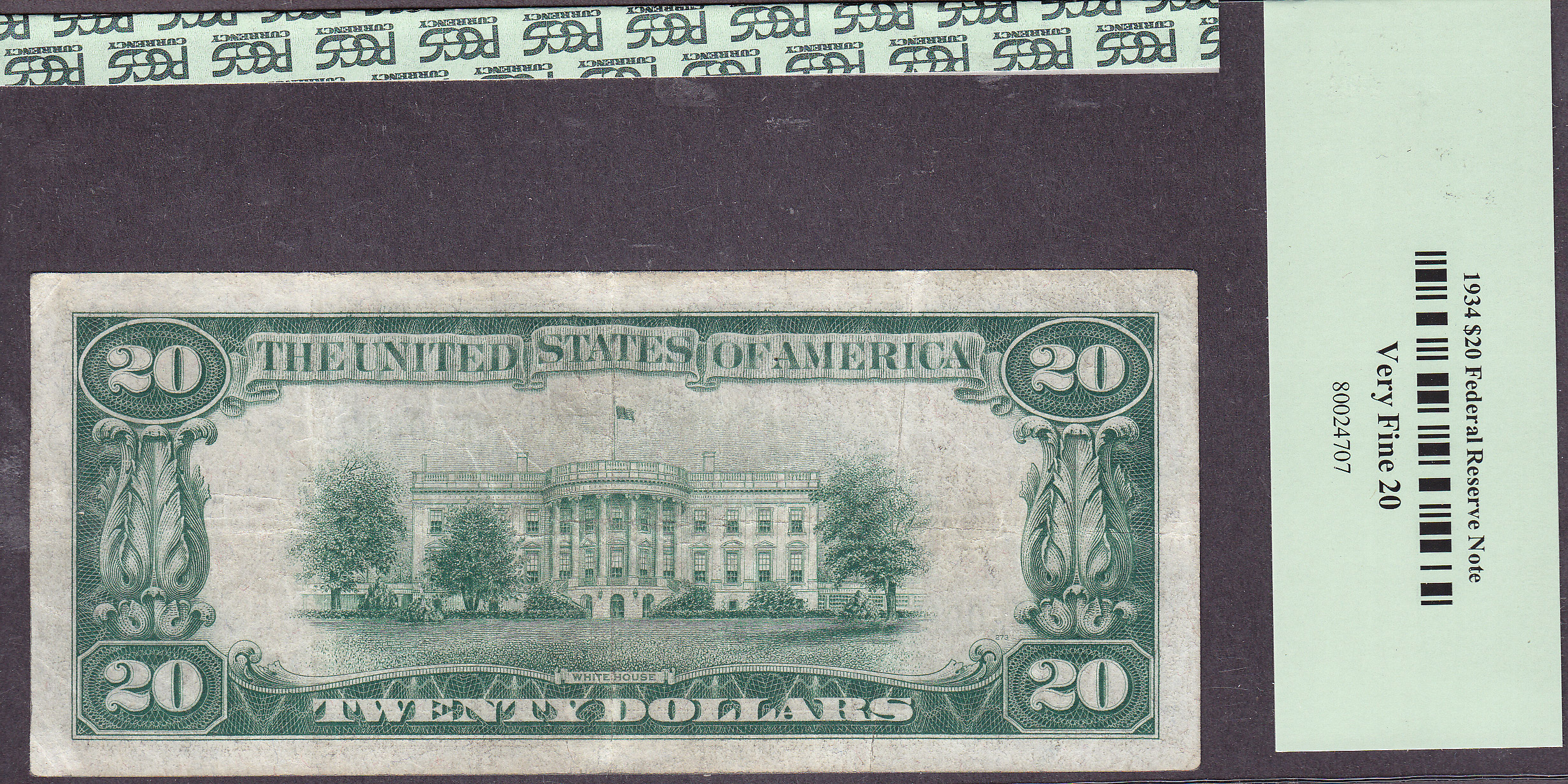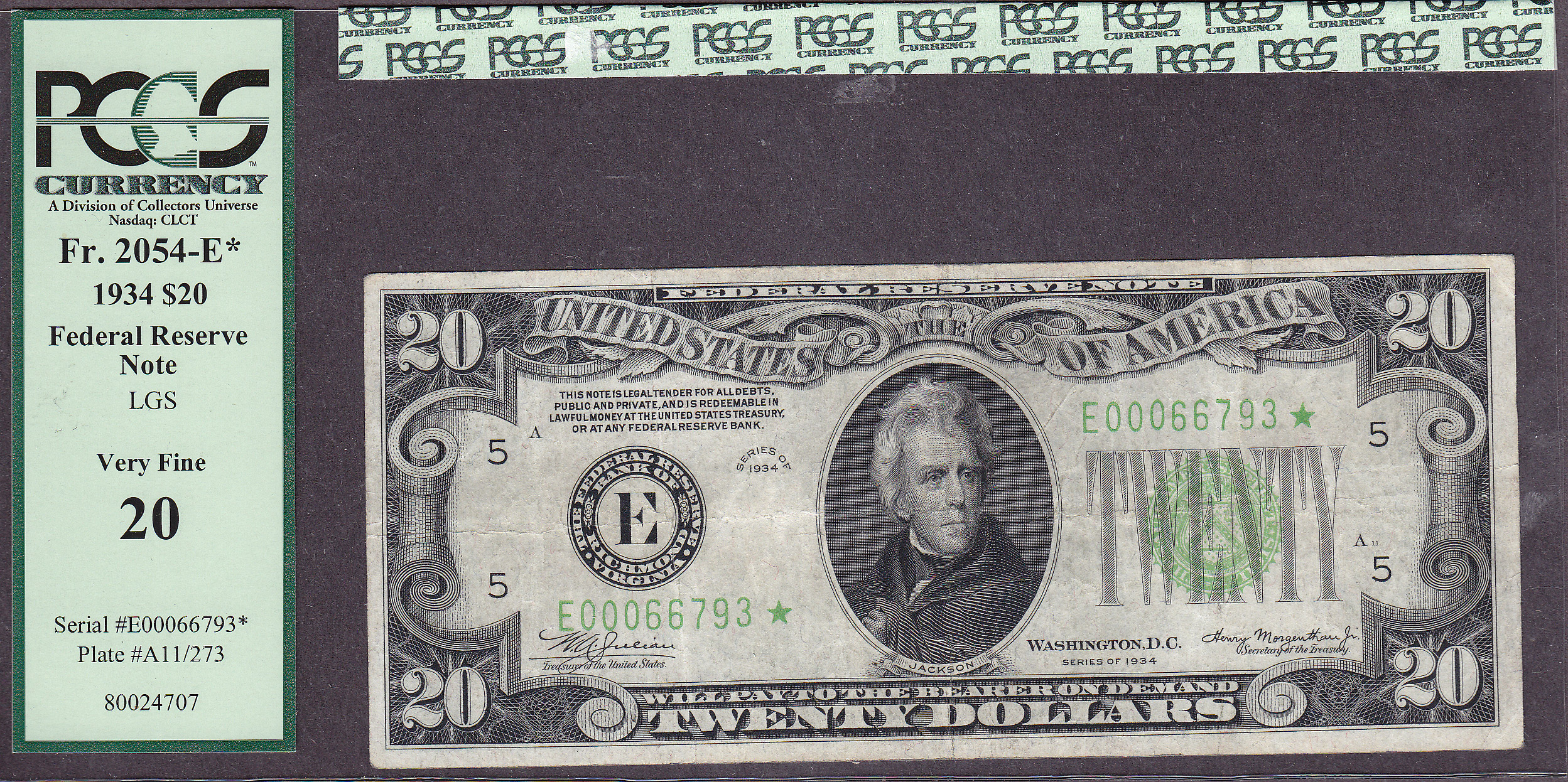 This is a 1934 $20 FRN star from the tougher Richmond district. It bears serail number #E00066793*. This is also the scarcer Light Green Seal varity. The new Oakes/Lindquist book says there is only one 1934 $20 LGS Richmond star known, well here is the second one known. Check the scans for additional details. This note has been graded as a PCGS VF-20. The holder has been cut at the ends to fit into my books.