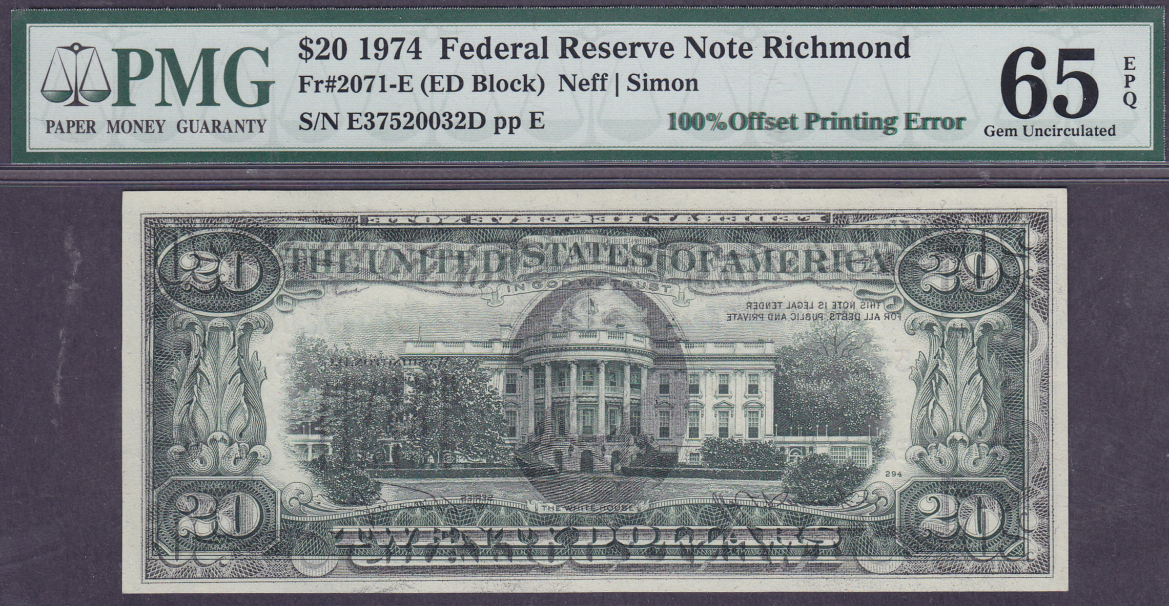Fr.-2071 1974 $20 Error Ser. E37520032D PMG 65 EPQ