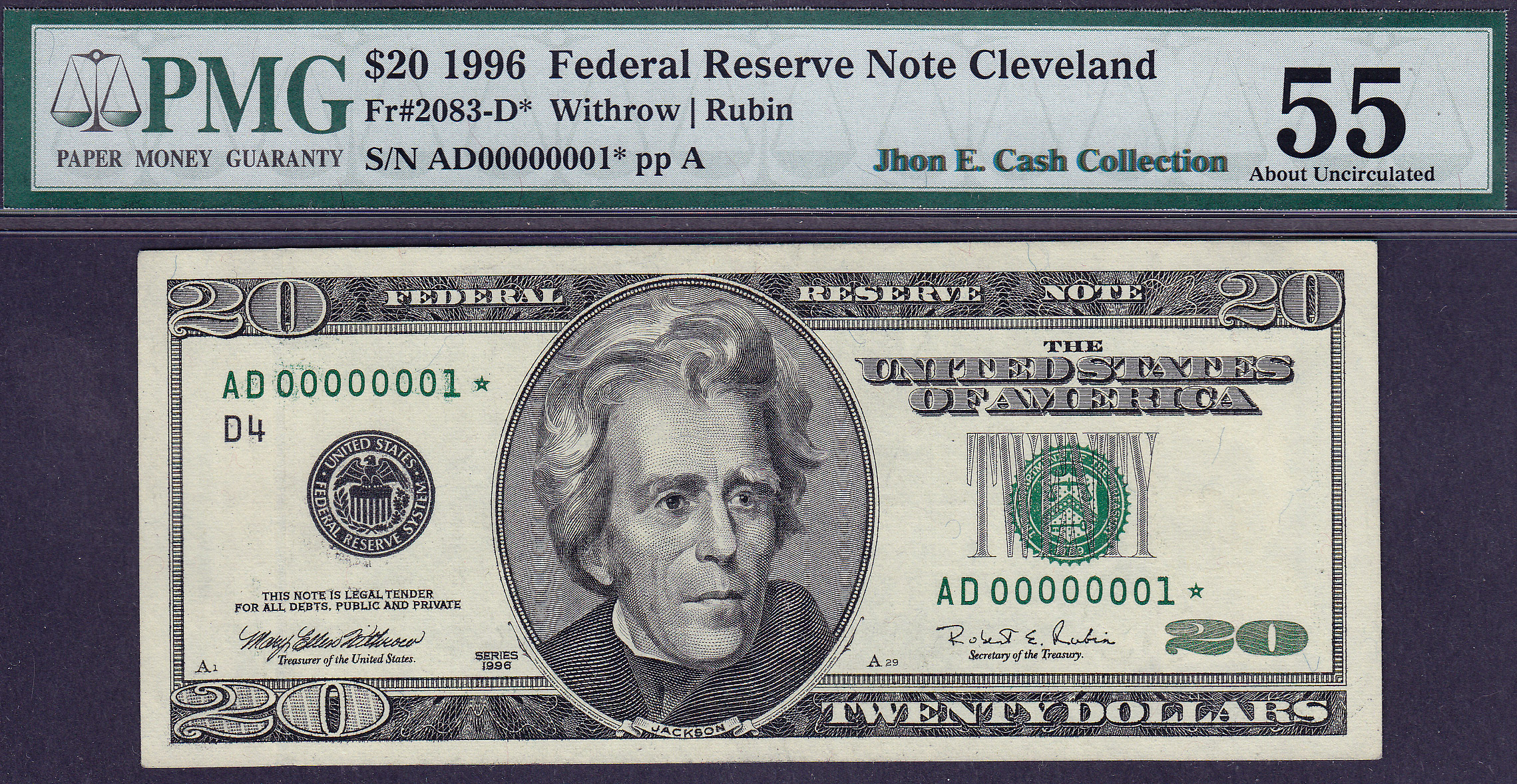ONLY TWO KNOWN! Here is another of the serial number one stars from the "Jhon E Cash Collection of Serial Number ones Stars". This is a 1996 $20 FRN form the Cleveland district and the serial number is AD00000001*.