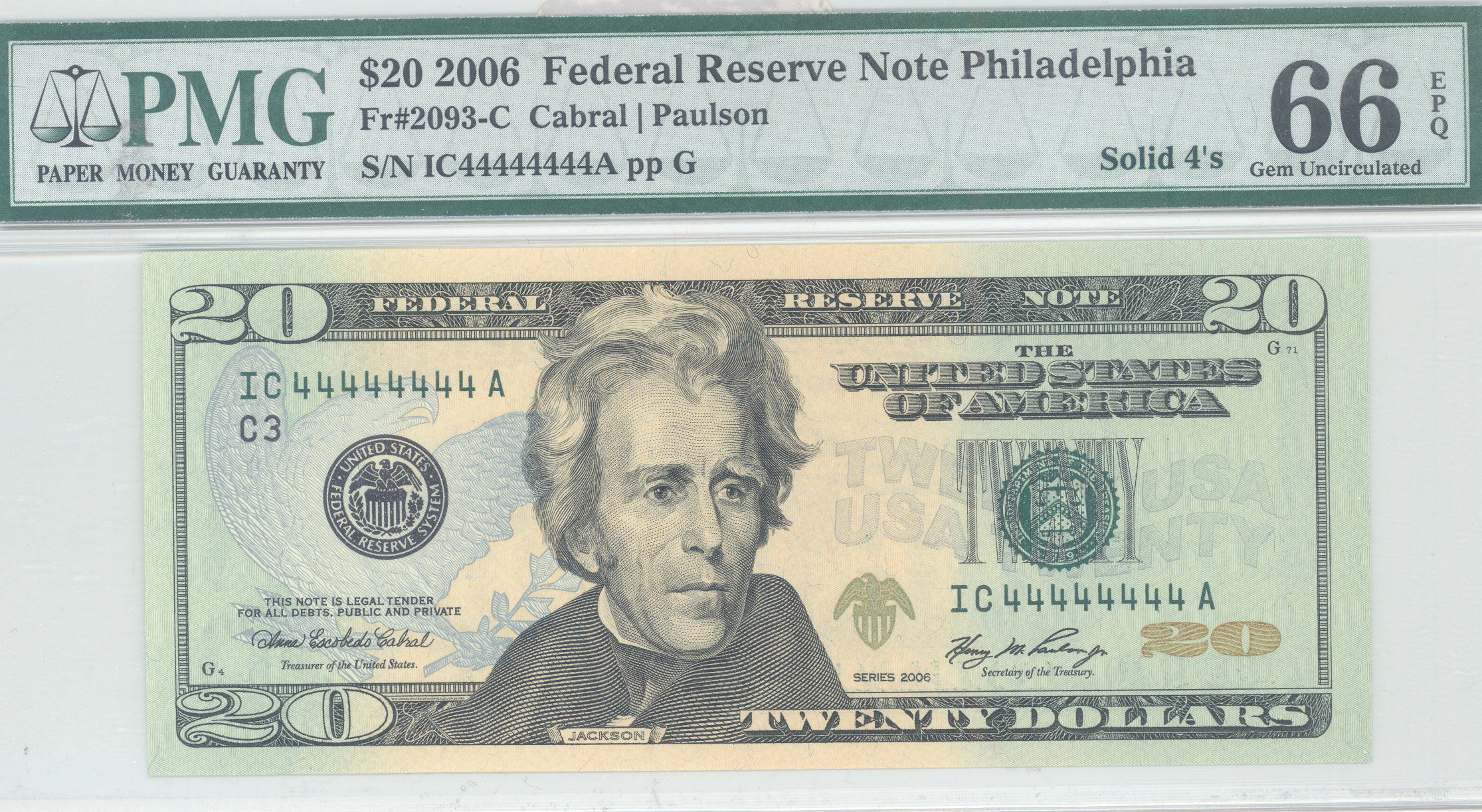 Solid fours! Here is a nice GEM example of a 2006 Philadelphia $20 FRN with the serial number of IC44444444A. It is in a PMG-66EPQ holder. A great price for a great liars poker note.