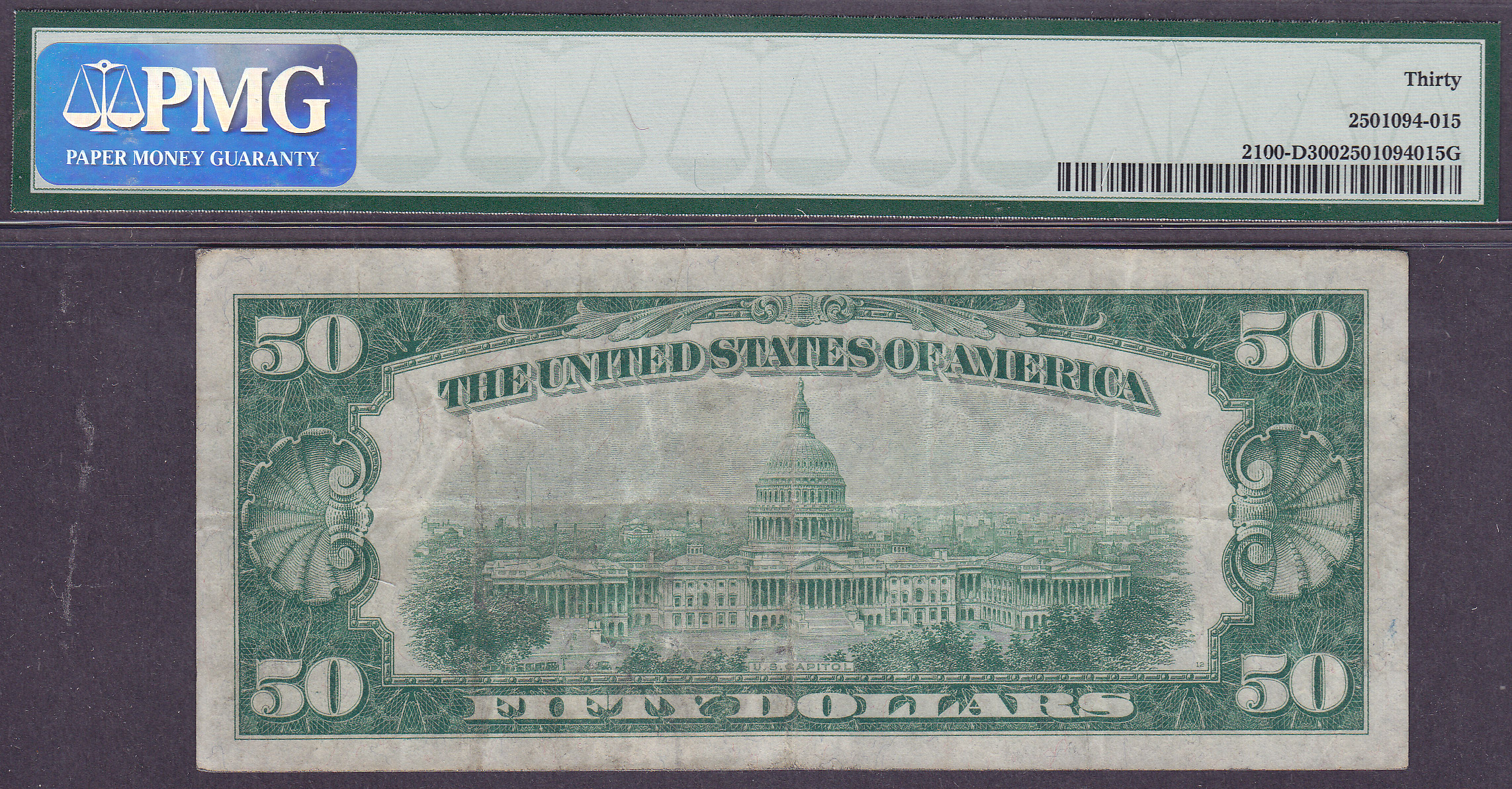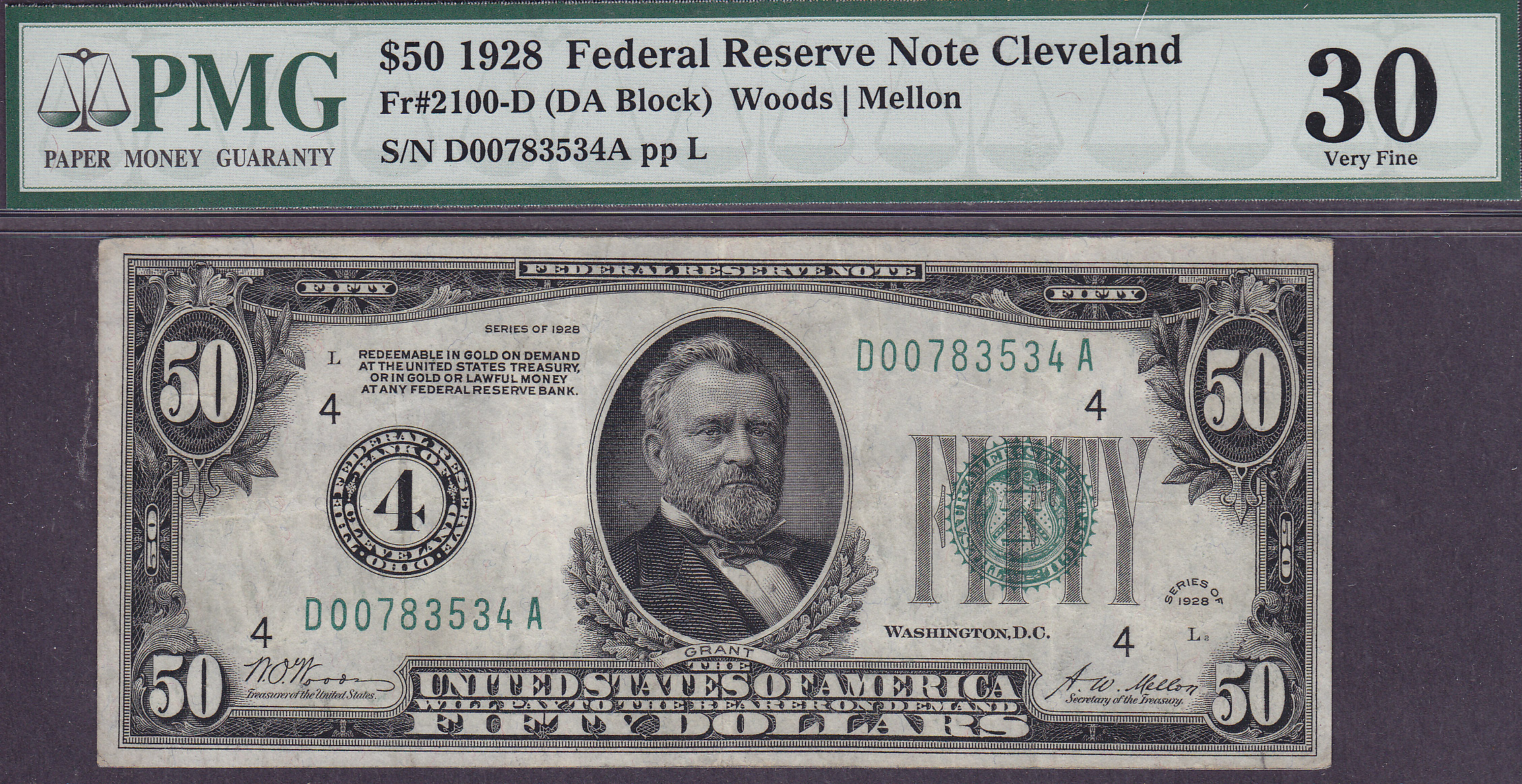 This is a 1928 $50 Cleveland is a very scarce note with only 48,000 printed. The serial number is D00783534A and it is in a PMG VF-30 holder. All 1928 FRNs are very scarce, get them all while you can. Just like gold... they are going up very fast. This note was previously in a CGA EF-40 holder.