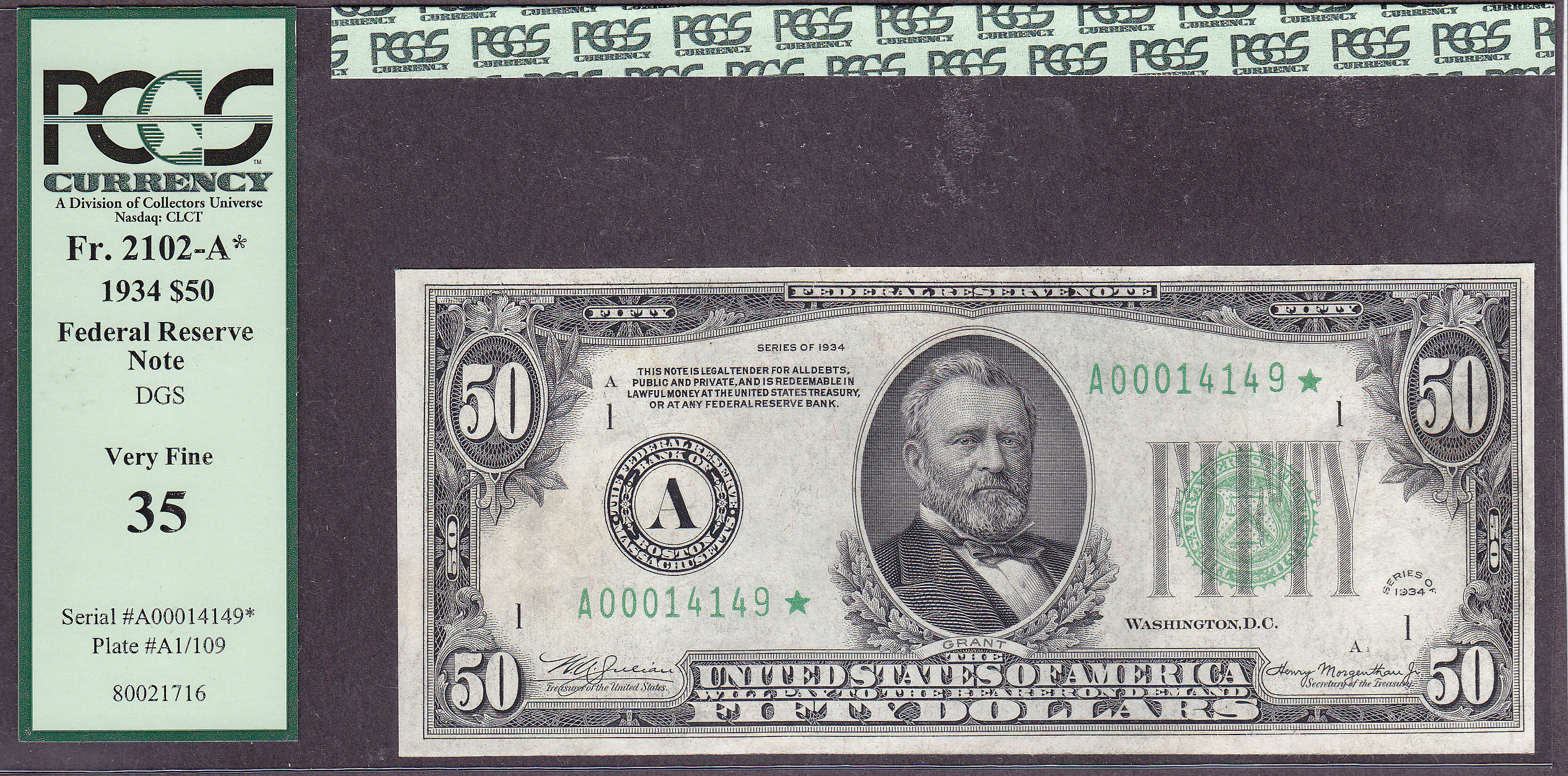 Here is a cool 1934 $50 Star FRN from Boston in a PCGS VF-35 holder.