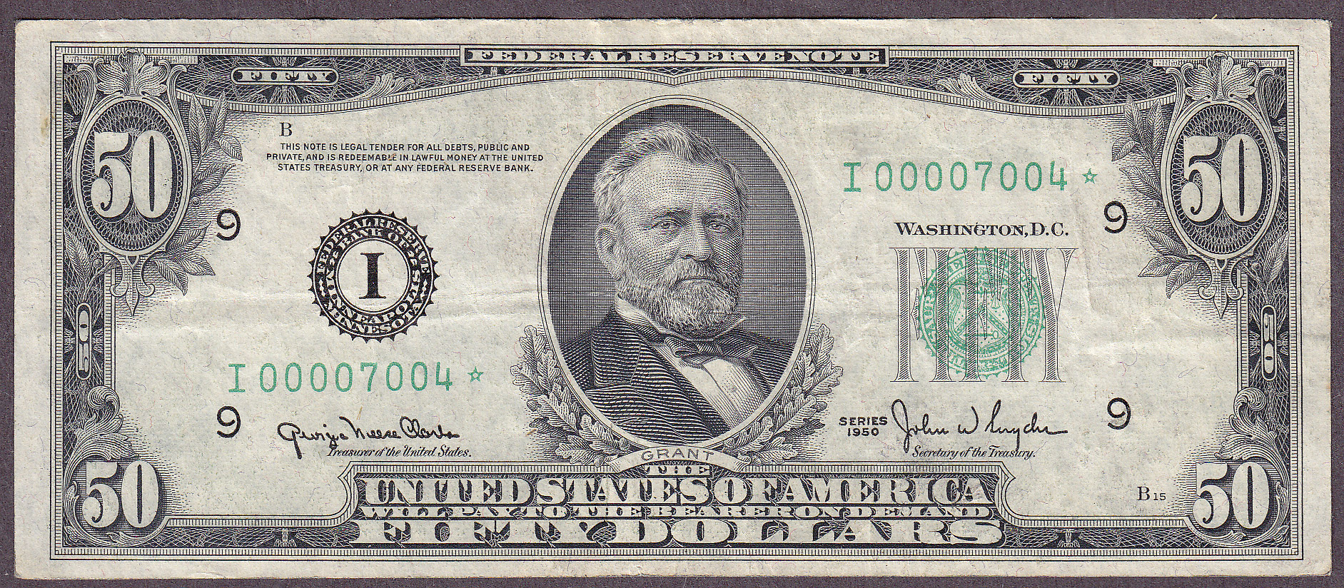 This is a very nice 1950 $50 FRN Star from the ever tough Minneapolis District. The serial number is I00007004*. There are no rips, tears or pinholes. Check out the large scans. There are only 3 reported so far. This is also the new low serial number known.