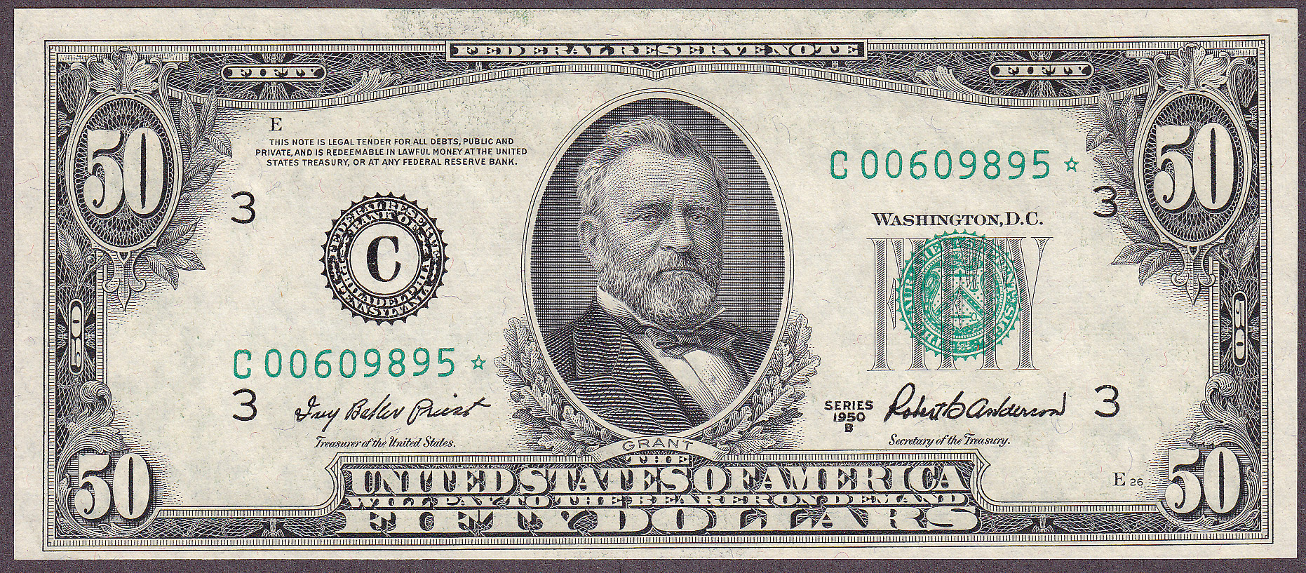 Here is an AU/Uncirculacted 1950B $50 New Philadelphia Star. The serial number is C00609895*. No rips, tears, pinholes or bank marks. A stunning example.