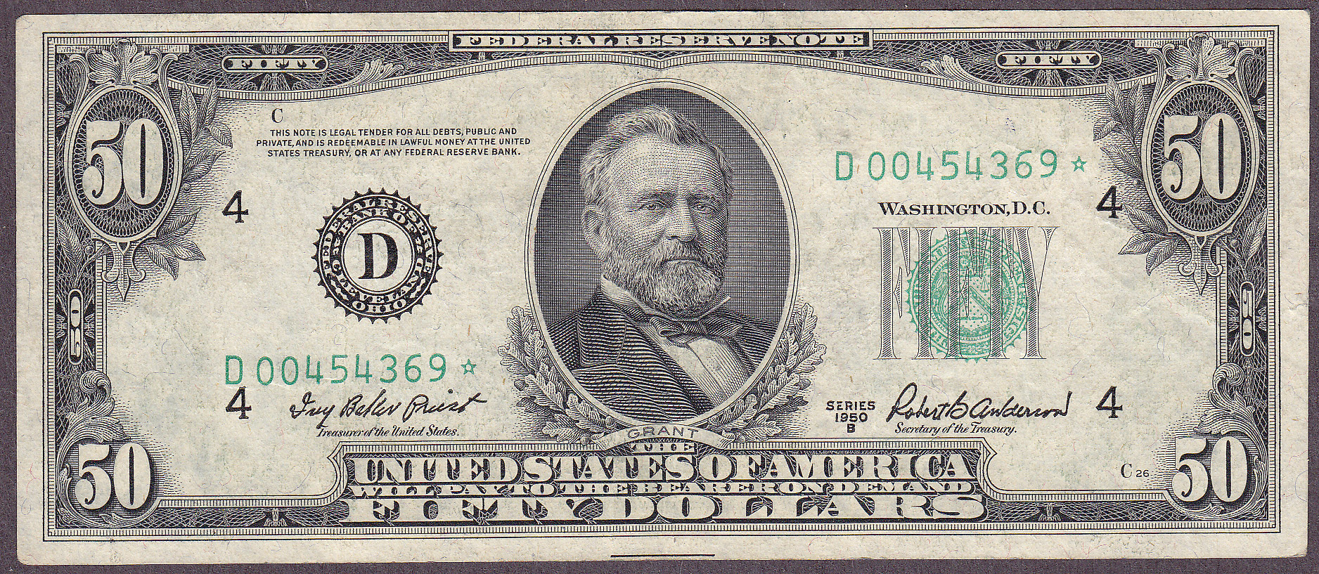 Here is an VF 1950B $50 Cleveland Star. The serial number is D00454369*. No rips, tears, pinholes or bank marks. A stunning example.