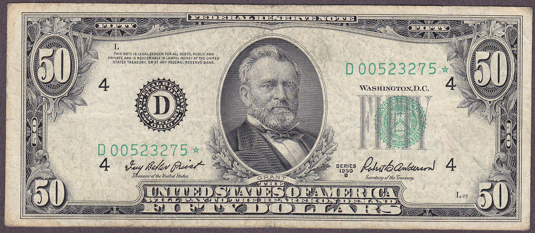 Here is an VF 1950B $50 Cleveland Star. The serial number is D00523275*. No rips, tears, pinholes or bank marks. A stunning example.