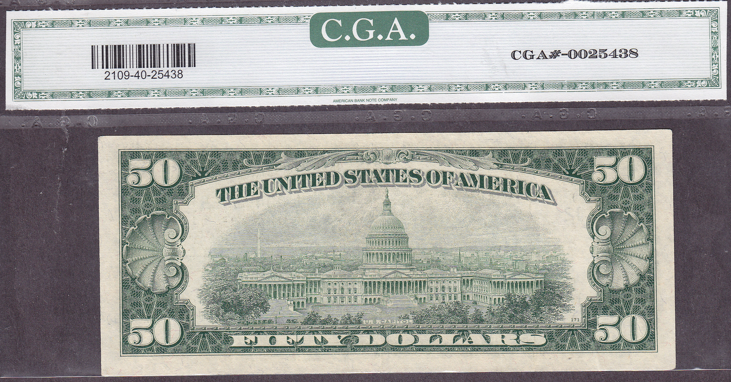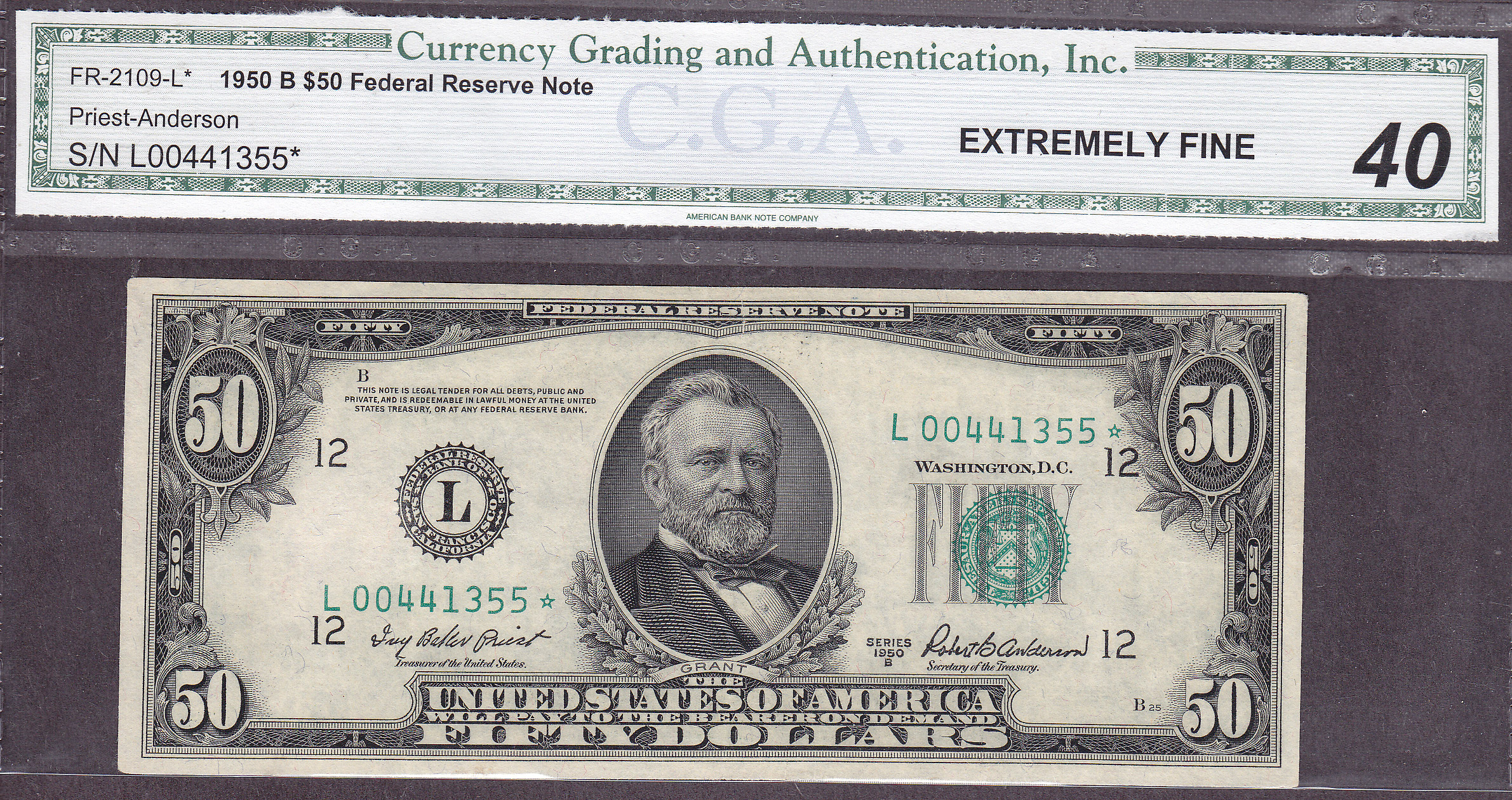 Here is a very nice1950B $50 FRN star from the San Francisco district. The serial number is L00441355* and is in a CGA-EF40 holder. There are no rips, tears or pinholes. Check the large scans. It certainly is priced to sell fast!