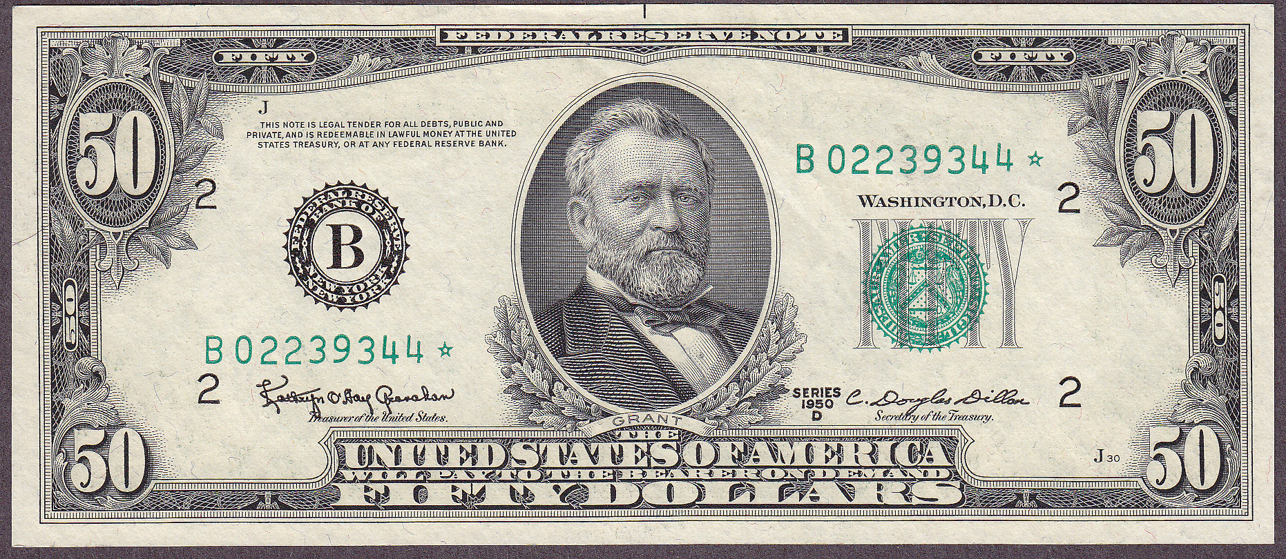Here is an UNC 1950D $50 New York Star. The serial number is B02239344*. No rips, tears, pinholes or bank marks. A stunning example of this tough 1950D* series.