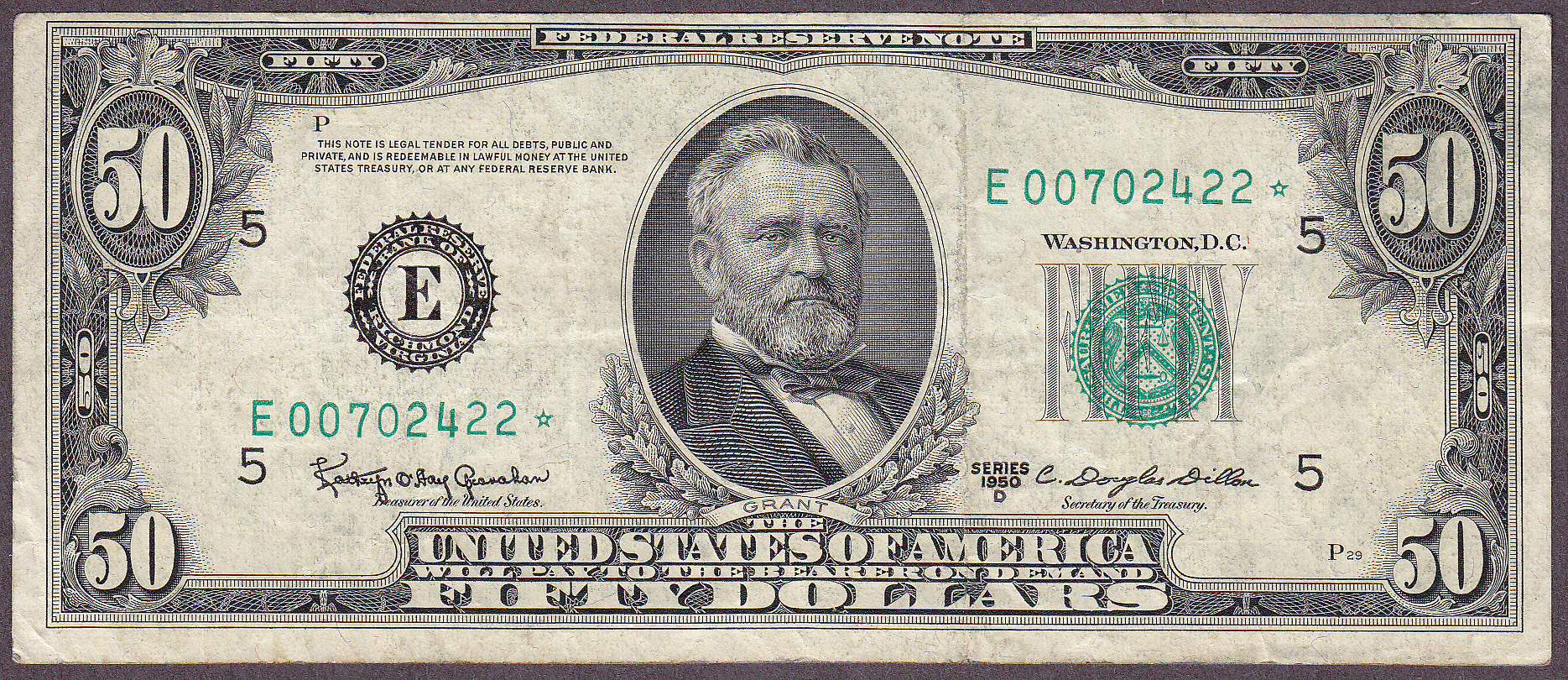 This is a new high serial number for the Oakes/Lindquest book. Here is an VF 1950D $50 Richmond Star. The serial number is E00702422*. No rips, tears, pinholes or bank marks. A stunning example of this tough 1950D* series. Richmond is a key note to the series.