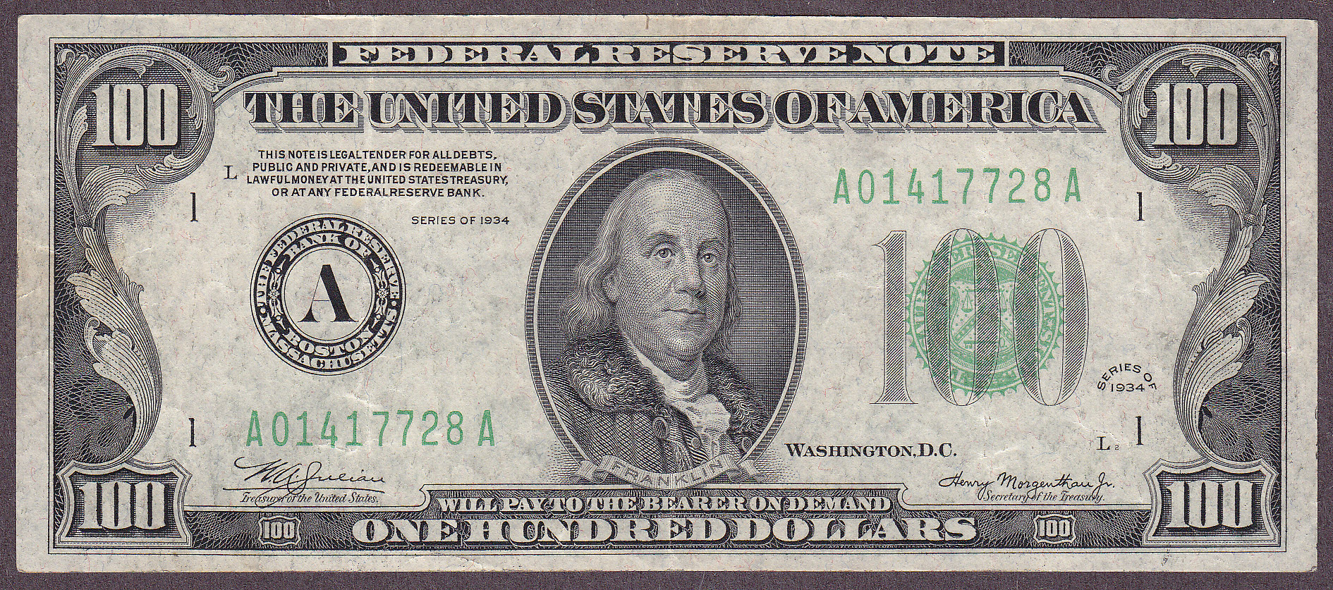 Fr.-2152 1934 $100 Boston FRN Ser. A01417728A Raw