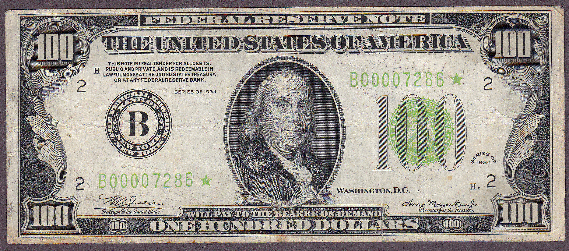 Here is a very scarce original 1934 Light Green Seal $100 FRN Star from the New York District. It has never been cleaned or pressed.Featuring decent margins with absolutely NO rips, tears, pinholes or markings. The low 4-digit serial number is B00007286*. This is a new low serial number from the 9th edition of the Schwartz/Lindquist book.