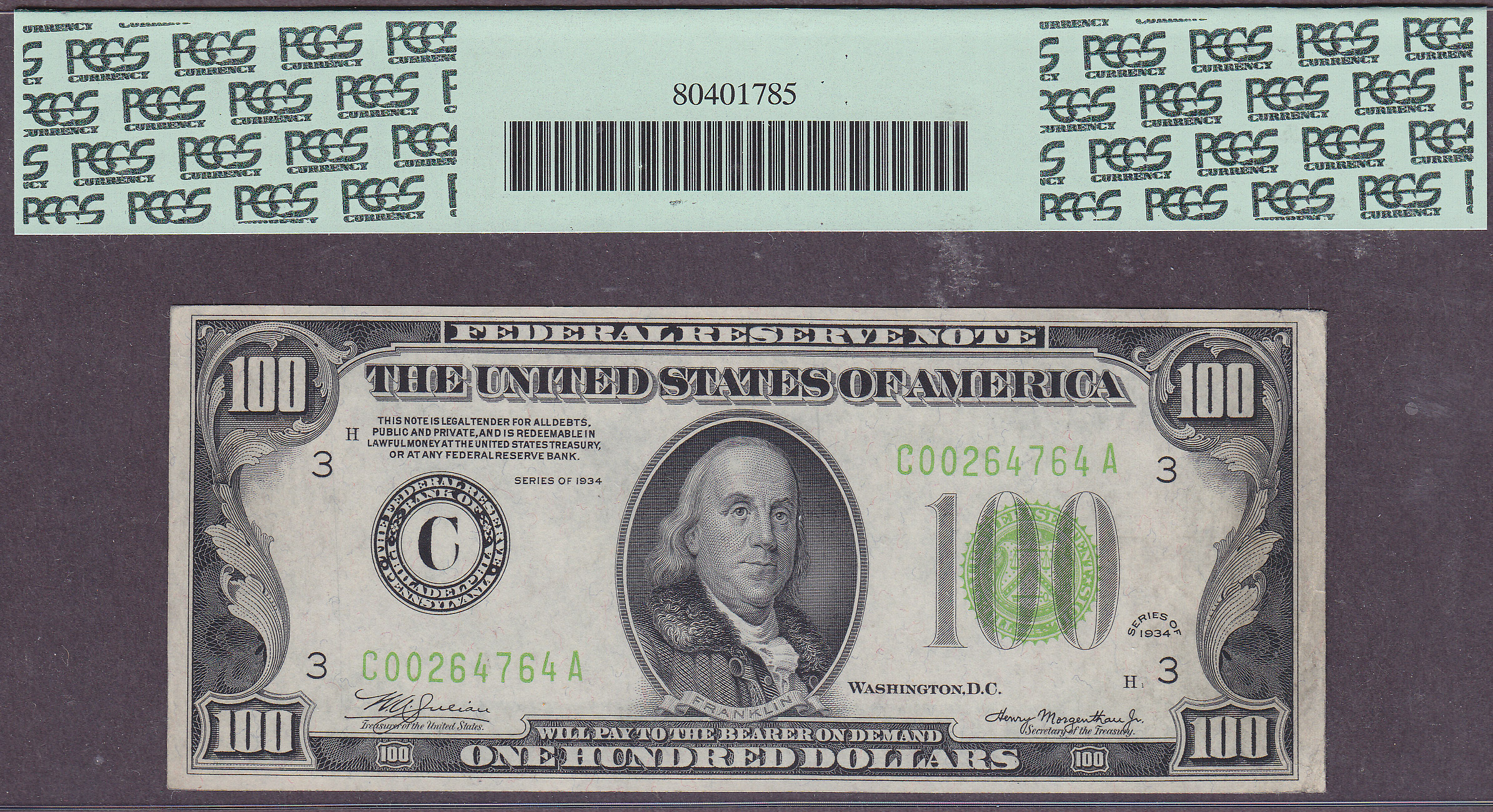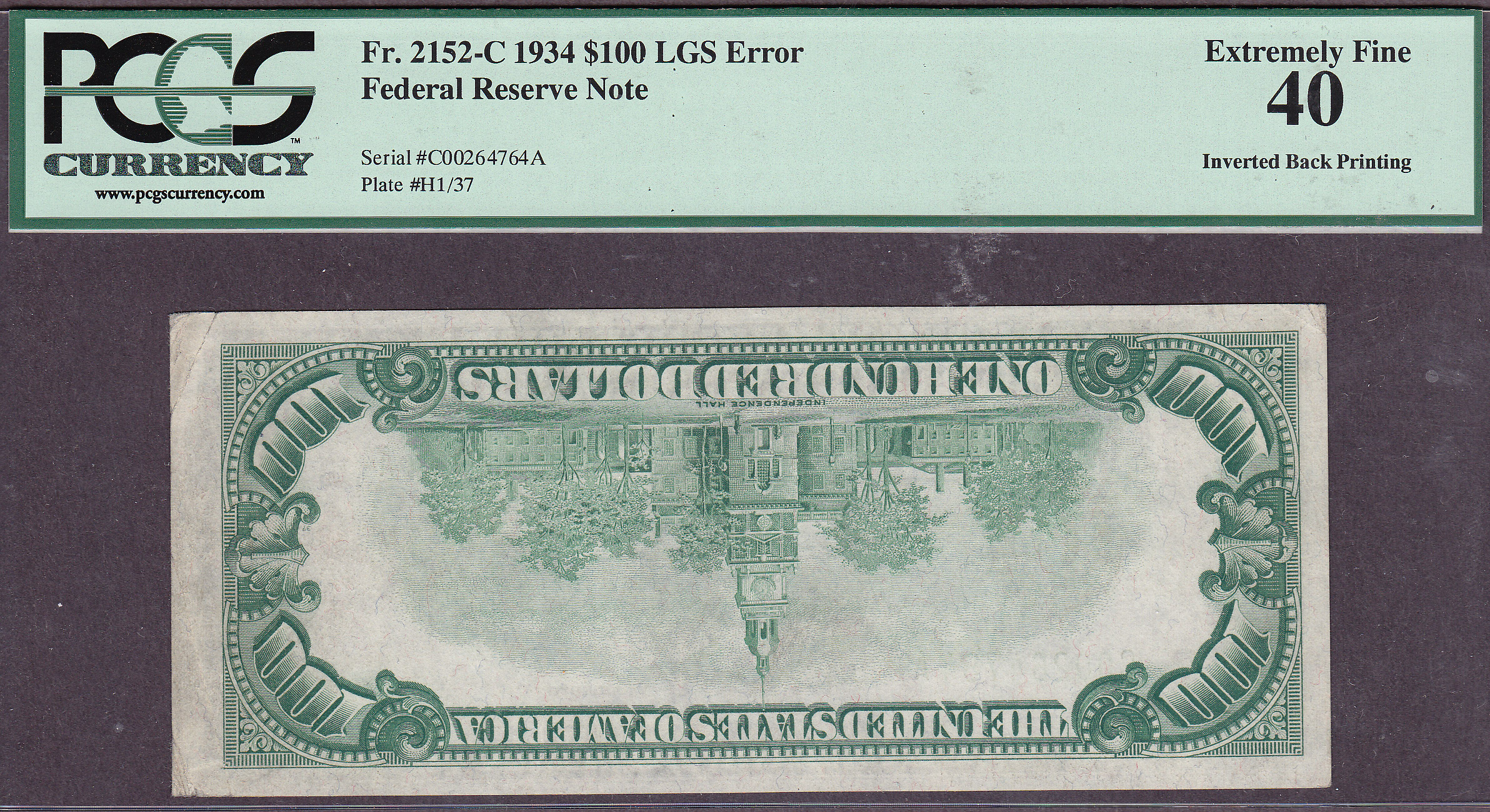 Fr.-2152C1934 $100 Philadelphia LGS (Invert Face Error) Ser. # C00264764A PCGS-40