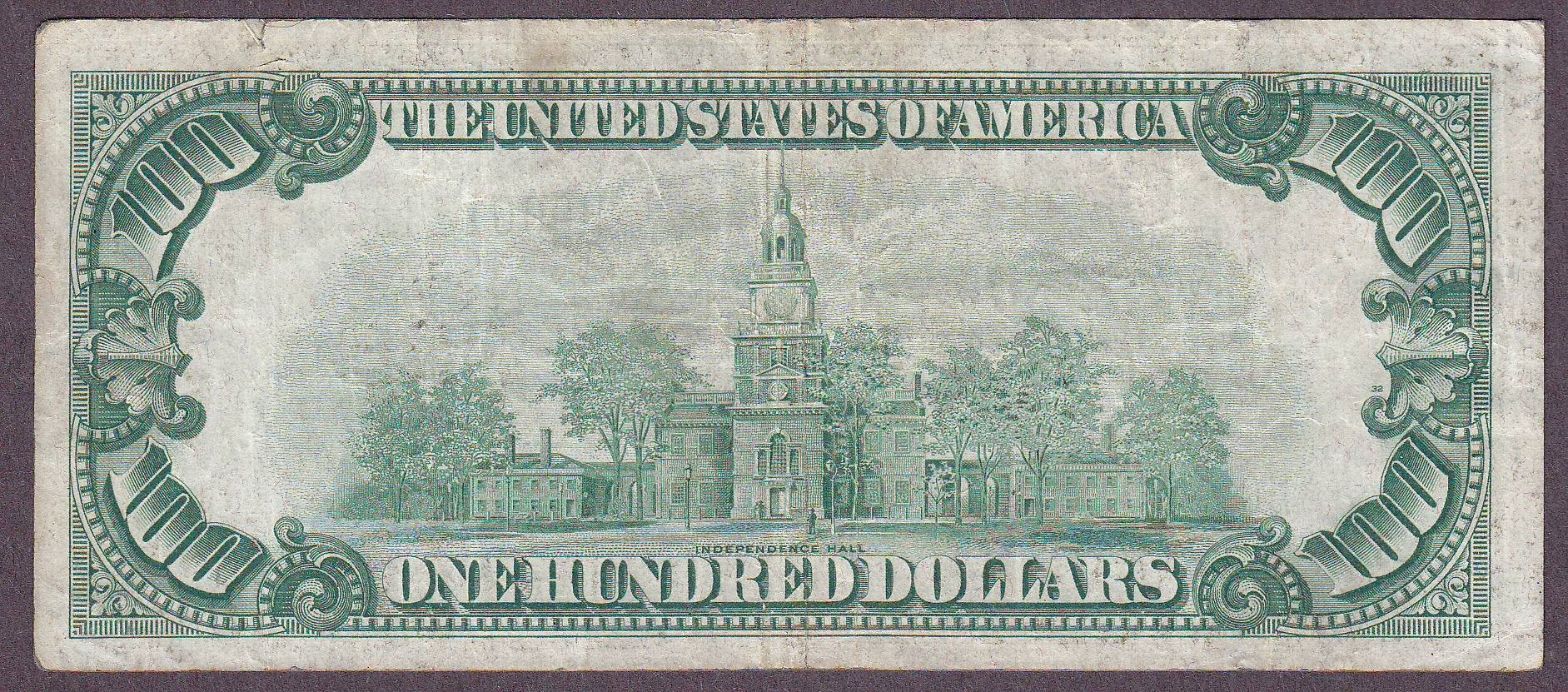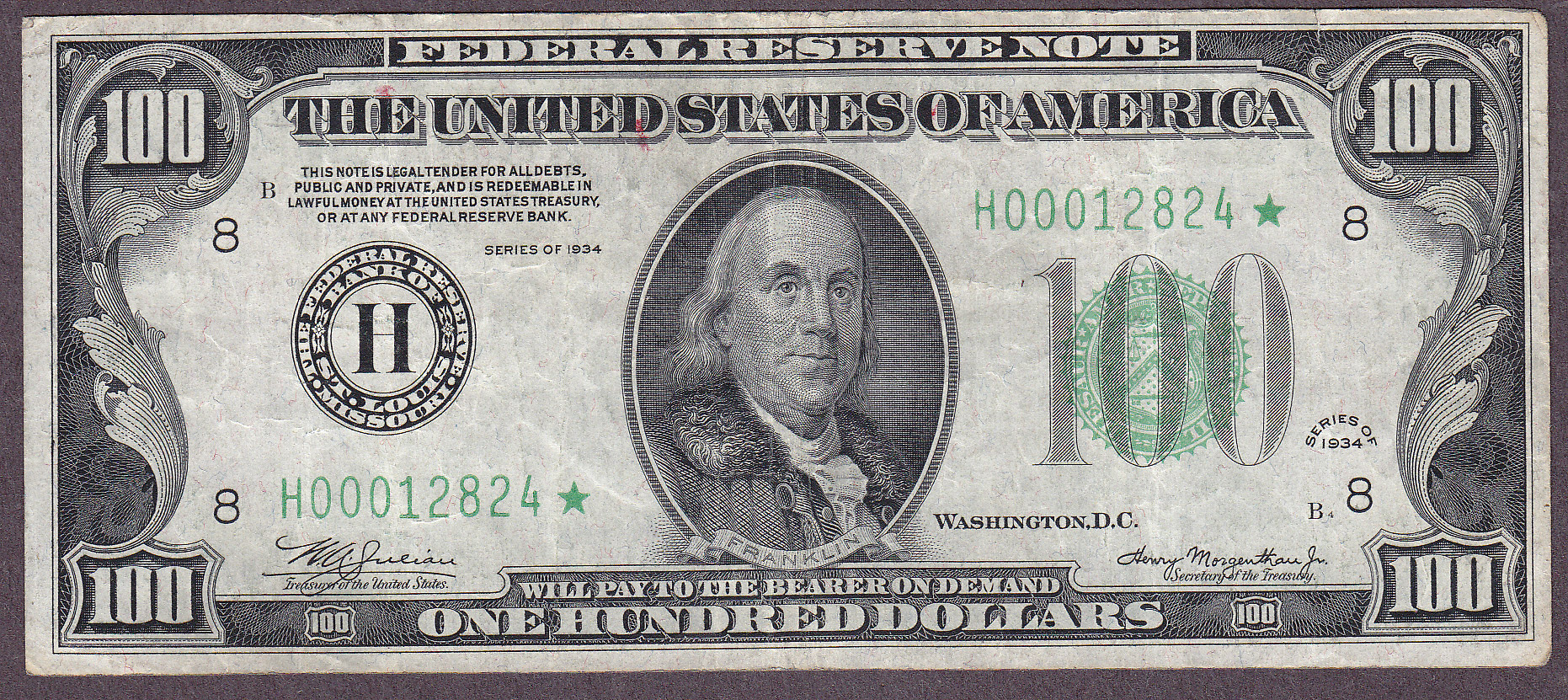 Here is a very scarce original 1934 Dark Green Seal $100 FRN Star from the St Louis District. It has never been cleaned or pressed.Featuring decent margins with absolutely NO pinholes or markings. The serial number is H00012824*. There is a small margin tear at the upper right margin