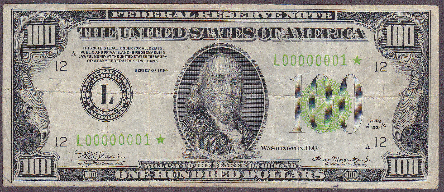 This is a super rare 1934 $100 San Francisco FRN star. This is only the second serial number one star on a $100 FRN. The other one was sold in the John Walker Whitney sale back in 2003 or 2005.Although this rare beast is circulated there are not any rips, tears or pinholes. This Light Green Seal variety is part of the Jhon E Cash Collection. i purchased this note back in September of 2001, one week after 911. It was part of the 5 serial number one stars that I acquired along with the 1934 $500 Kansas City FRN, serial number J00000001*. This is your chance to own part of something very special that most collectors only dream about.