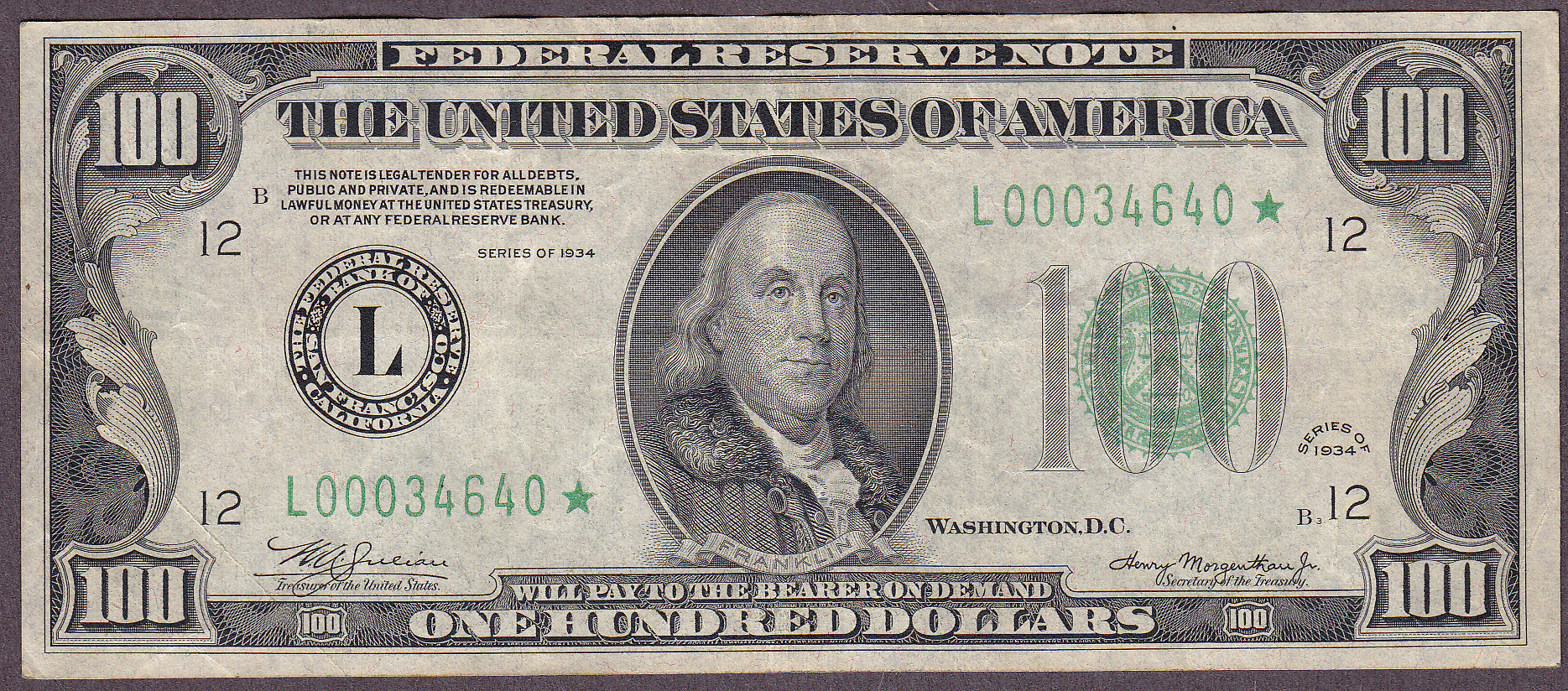 Here is a original 1934 $100 FRN Star from the San Francisco District. It has never been cleaned or pressed.Featuring decent margins with absolutely NO rips, tears, pinholes or markings. The serial number is L00034640*.