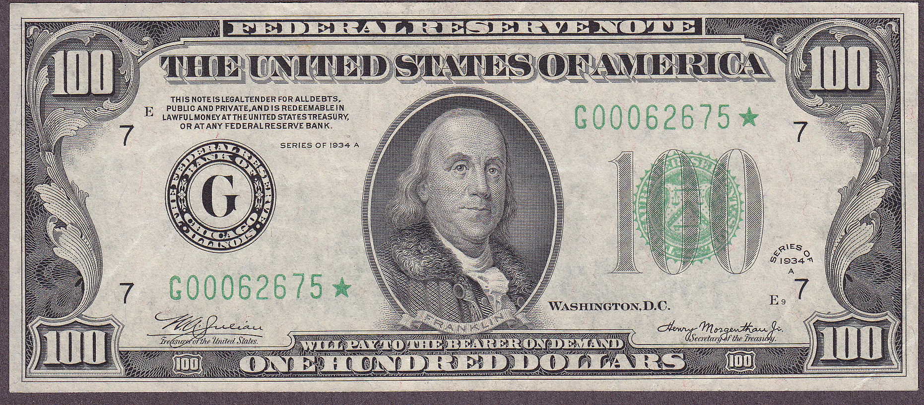 Here is a very scarce original 1934A Mule Green Seal $100 FRN Star from the Chicago District. Featuring great margins with absolutely NO rips, tears, pinholes or markings. The serial number is G00062675*. This snote is s solid AU because of the slight corner bend in the lower left corner.
