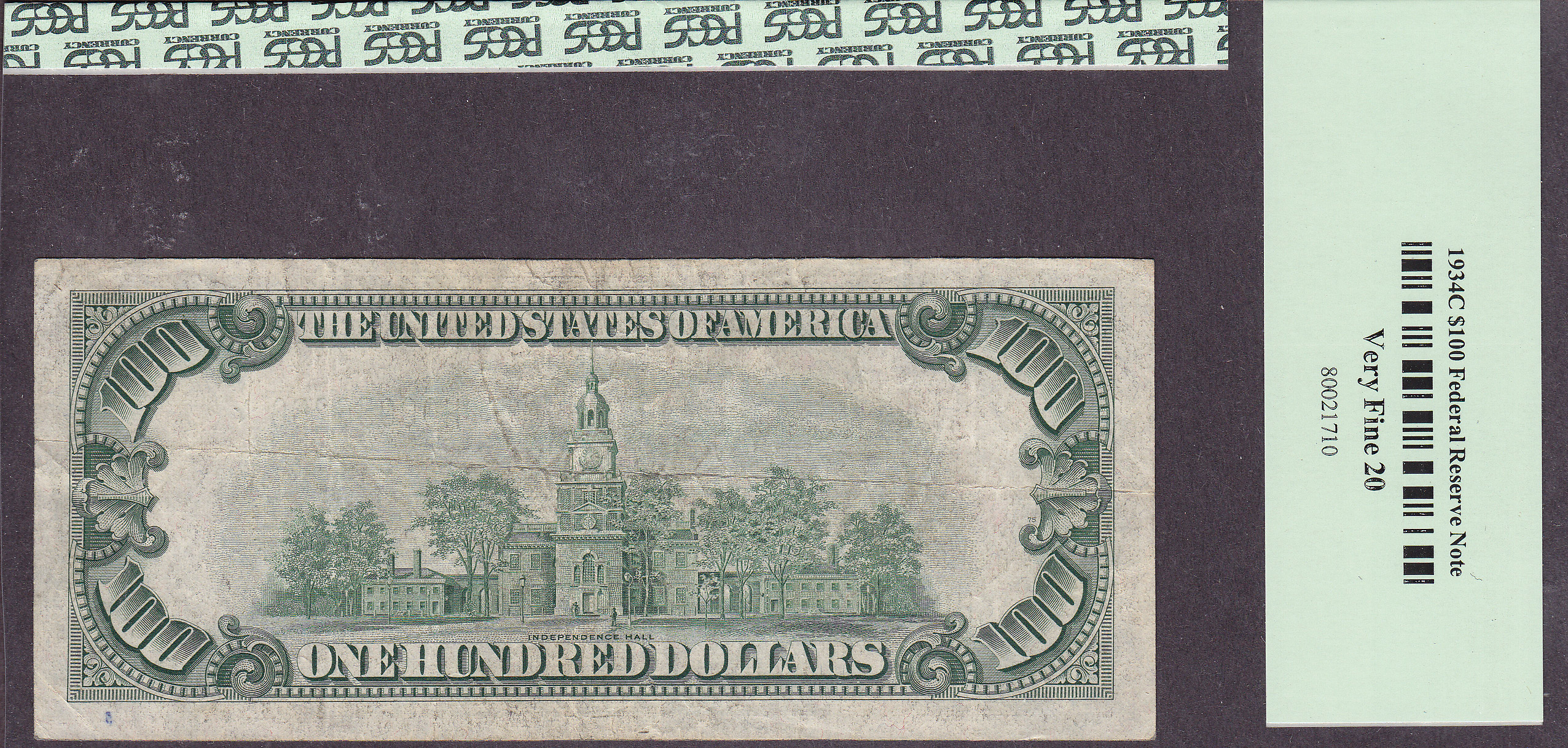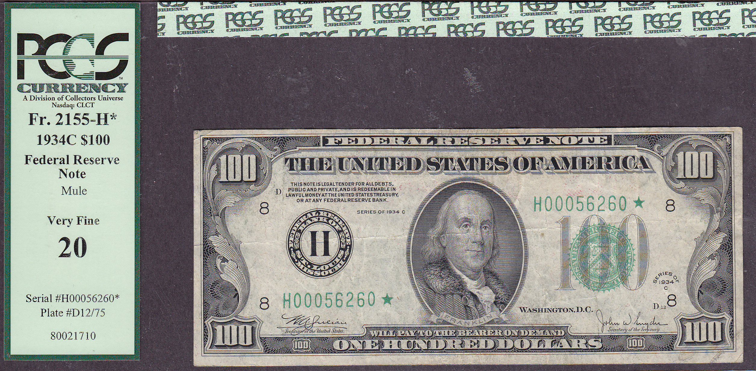 This is one rare St Louis Star! When was the last iime you got to view a 1934C $100 FRN St Louis Mule Star? It has been a while, maybe never. Ive only ever seen two of them and neither one was cheap or in any great condition. This VF note has no rips, tears, pinholes or bank marks. It has never been cleaner or pressed. Look at the large scans, they dont lie. The serial number is H00056260* and it is graded as a VF-20. I cut the end of all the PCGS holder to fit them into my book. However I guarantee all of the PCGS grades, 100% or money back.