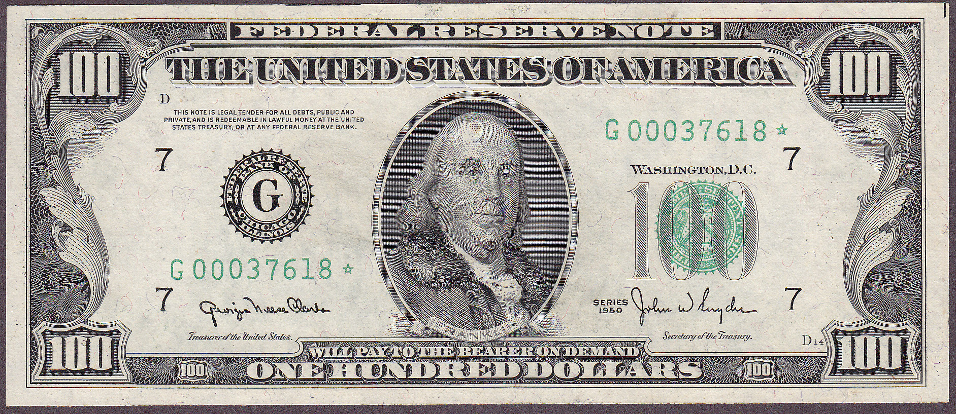 This is a real nice Uncirculated 1950 Chicago $100 Star note. You never find the old star notes in this high of condition. The serial number is G00037618*. The back plate number is 103. There are no rips, tears, pinholes or bank marks. Totally original, never doctored.