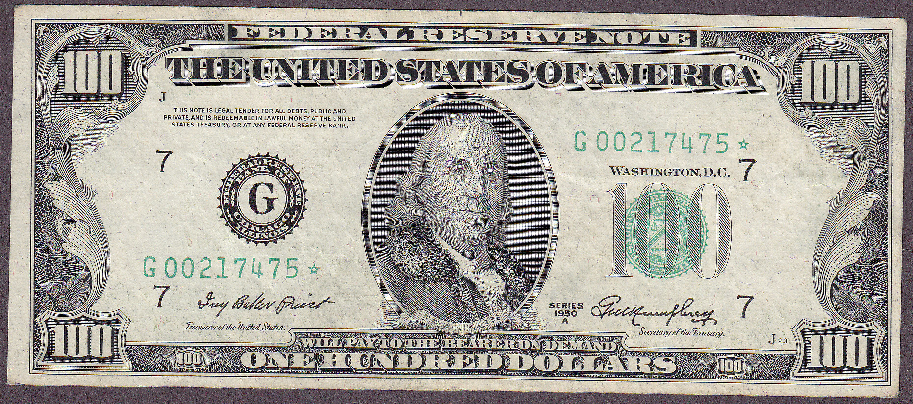 Here is a nice 1950A $100 Chicago star note. The serial number is G00217475*. There are no rips, tears, pinholes or bank marks. It is totaly original with no cleaning or pressing.