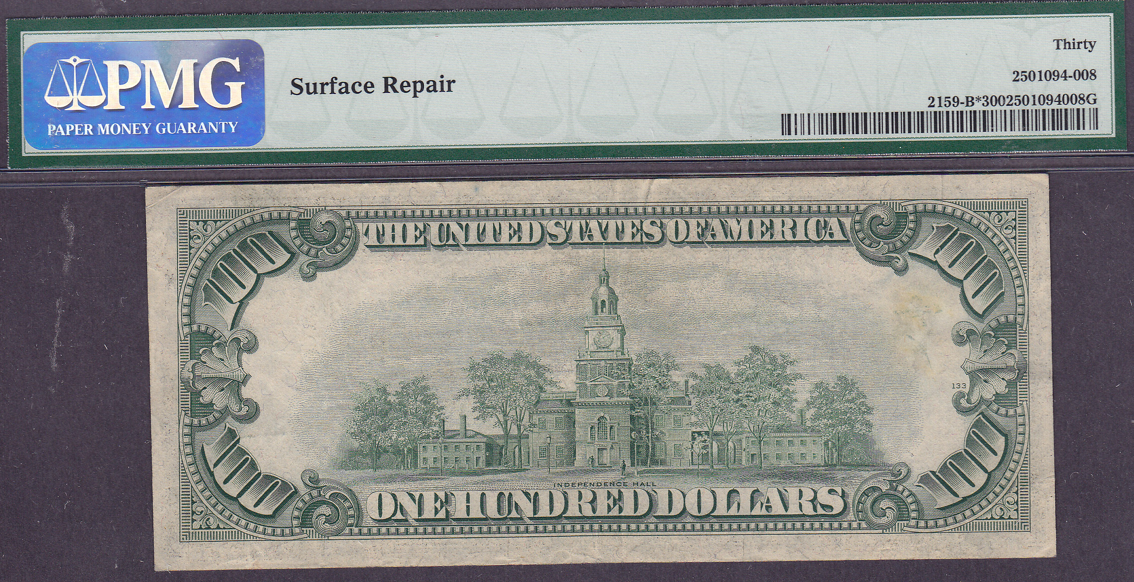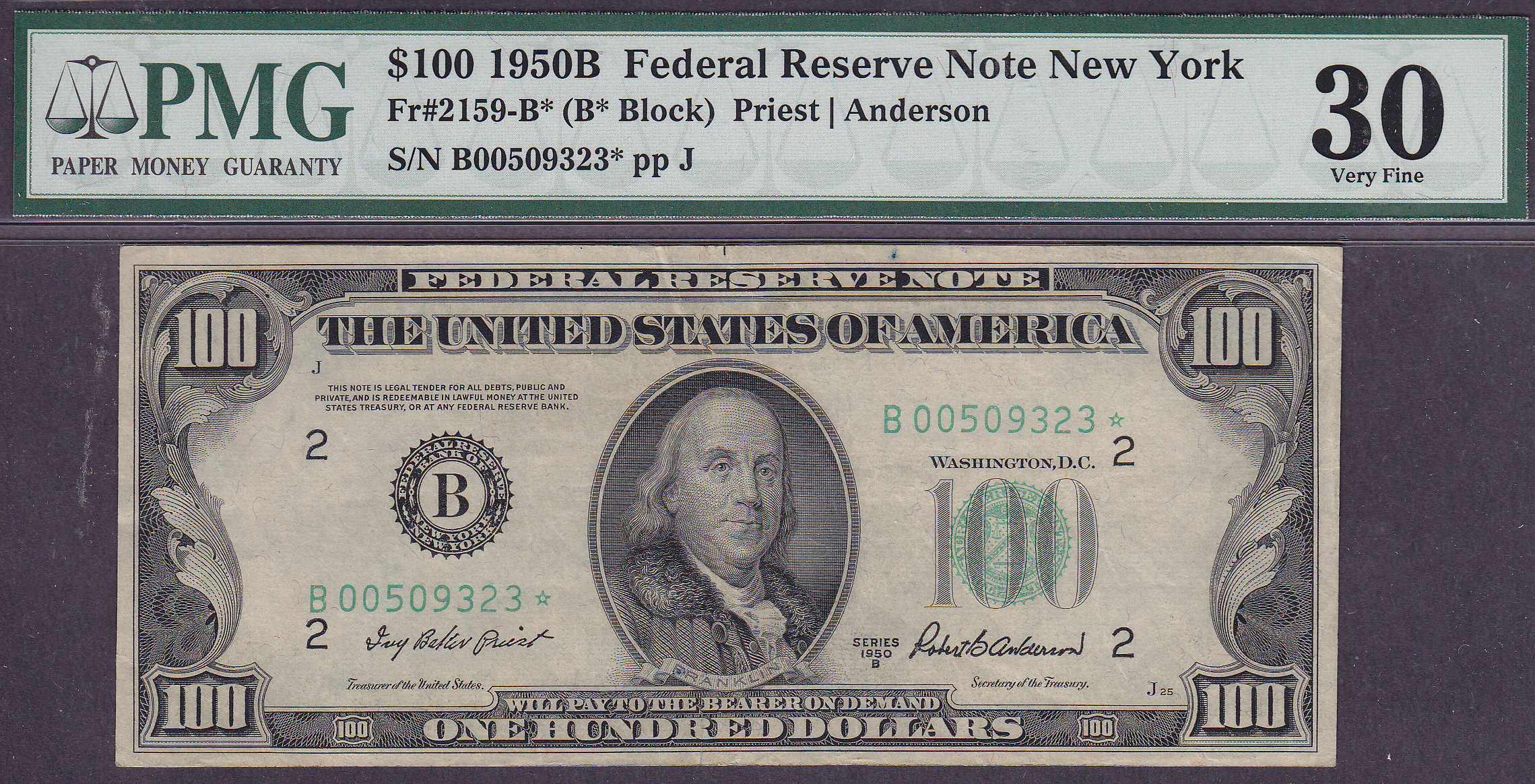 Here is a 1950B $100 New York Star with serial number B00509323*. It was previously in a CGA-45 holder and now it is a PMG VF-30 with surface repair. Someone tried to erase a pencil number on the back.