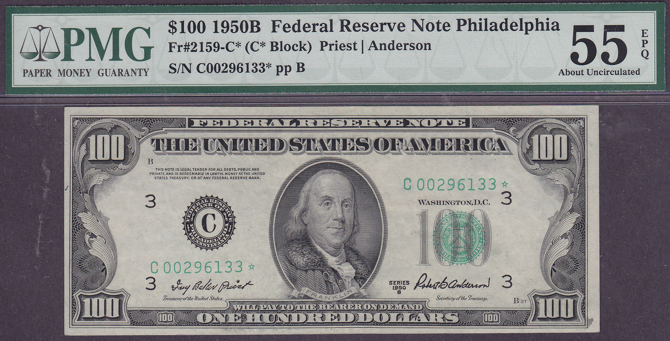 Here is a nice 1950B $100 FRN Philly Star. It is in a PMG VF-55EPQ holder. The serial number is C00296133*